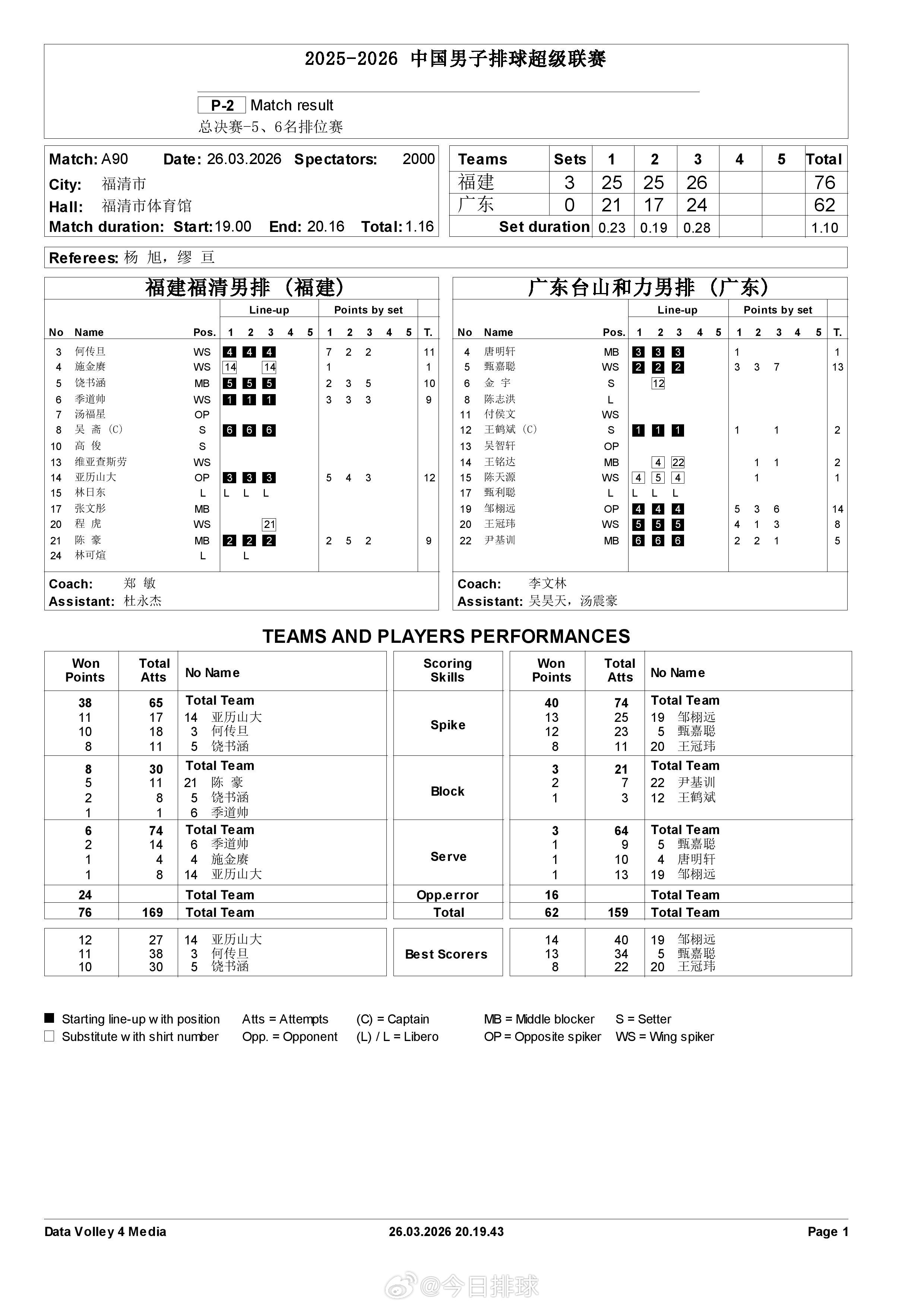 2025-2026中国男排超级联赛 A级总决赛五、六名决赛首回合福建3-0广东得分统计。