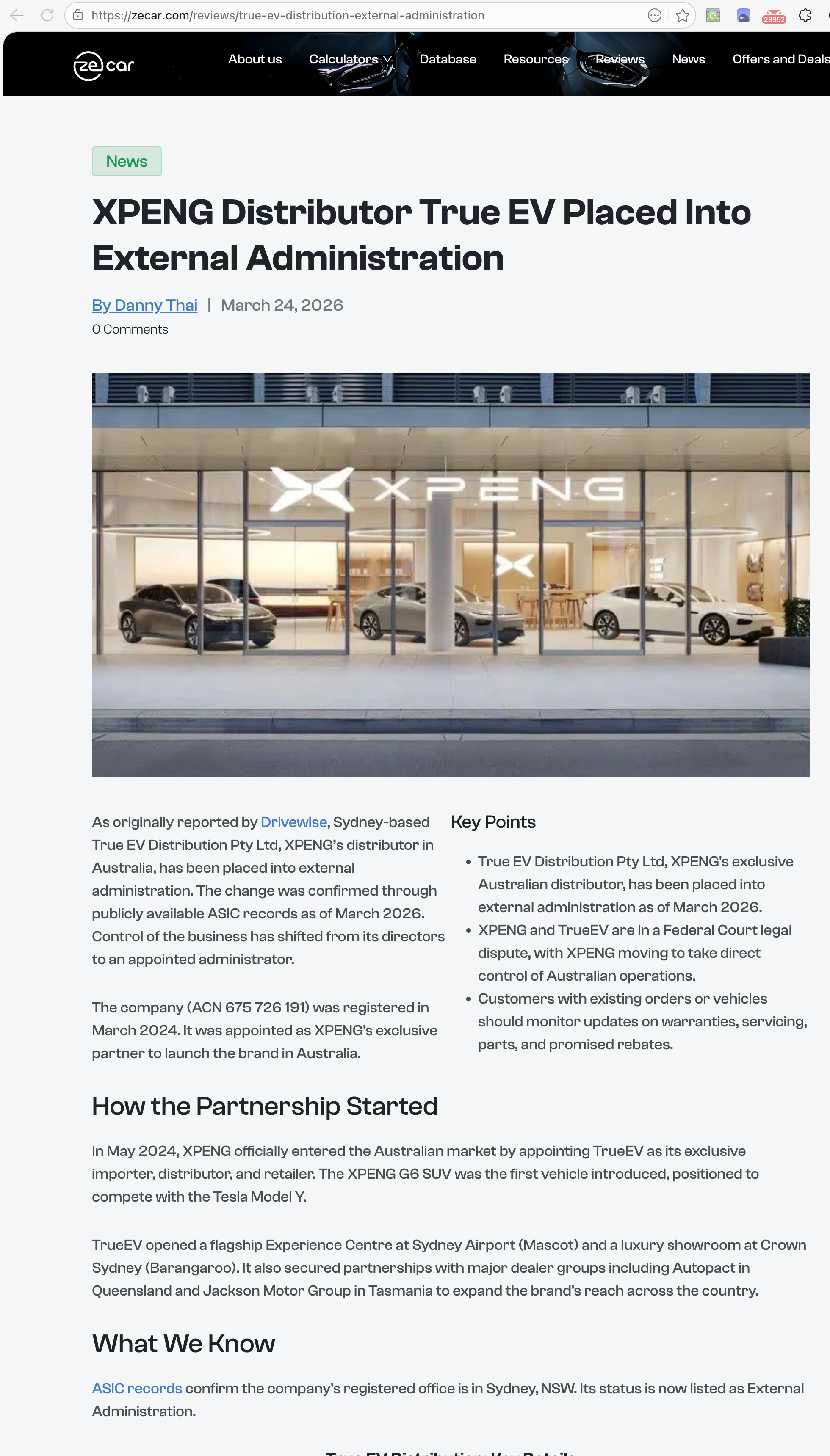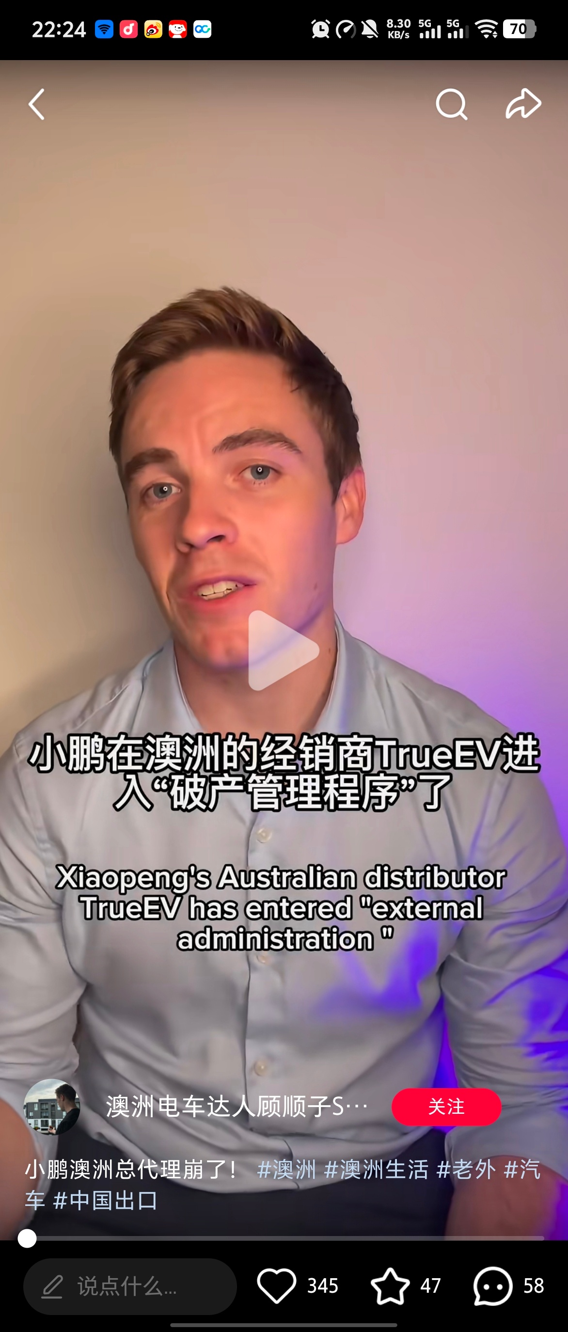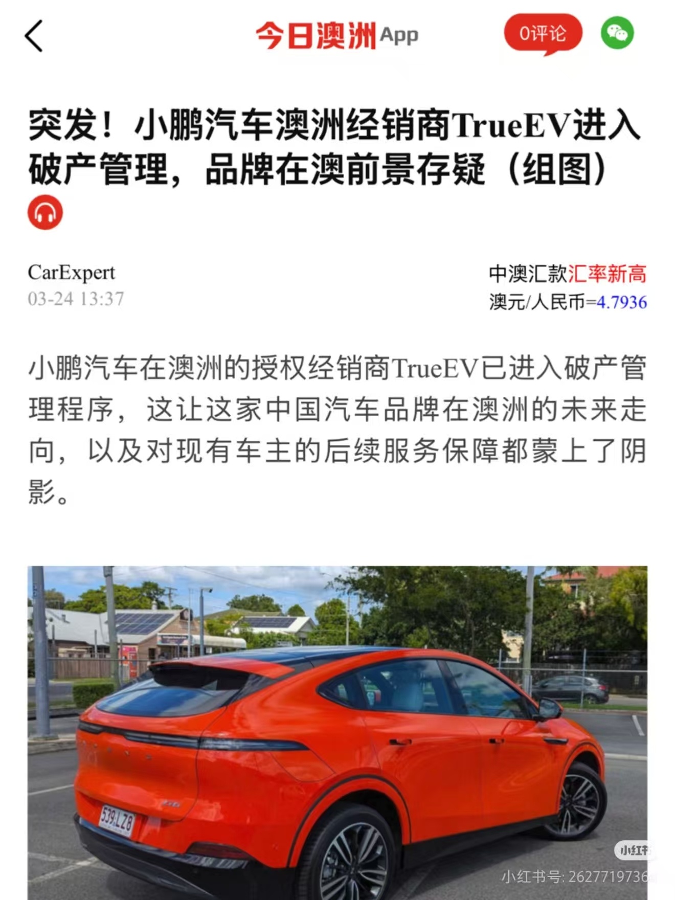 最近群里刷到一条小红书和新闻,说小鹏汽车澳洲经销商TrueEV进入破产管理,品牌在澳前景存疑(图1、图2)。看起来是经销商的问题,查了一下可能确实是经销商的问题,不过从某种角度上来讲,这是中国汽车企业出海必须经历的一课。