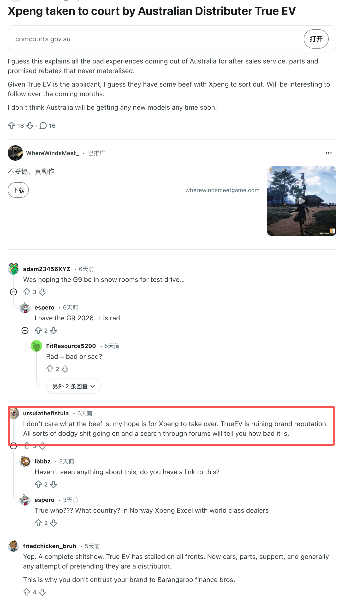 我一点儿都没有恶意揣测True EV,看reddit上澳洲本地车主的意思(图4),澳洲经销商TrueEV公司可能确实不太行,他们倒是真的希望小鹏自己直接接手。从案件的时间线上,也可以看出来整个过程大概率就是TrueEV在搞事:2026年3月3日True EV 正式起诉小鹏;2026年3月中旬True EV 宣布进入外部管理,委任 Cor Cordis 为管理人;2026年3月26-27日:法院将举行听证会,审理相关证据。