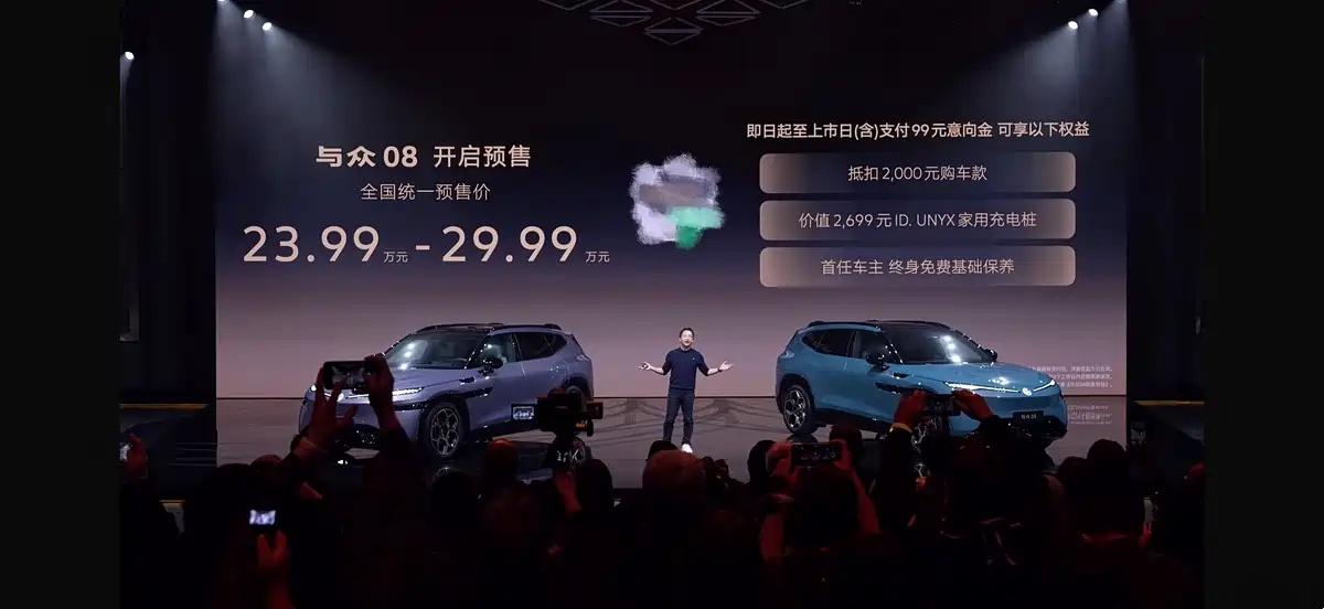 懂车之道讯3月26日,大众汽车安徽正式宣布,旗下与众08正式开启预售,预售价区间为23.99-29.99万元。作为大众“在中国,为中国”战略落地的重磅产品,官方把新车描述为“全时互联全尺寸纯电SUV”。与众08定位中大型SUV,采用了全新的设计语言,内饰设计与配置全部以中国本土化需求为出发点进行了优化,动力上将提供单电机后驱与双电机四驱可选。