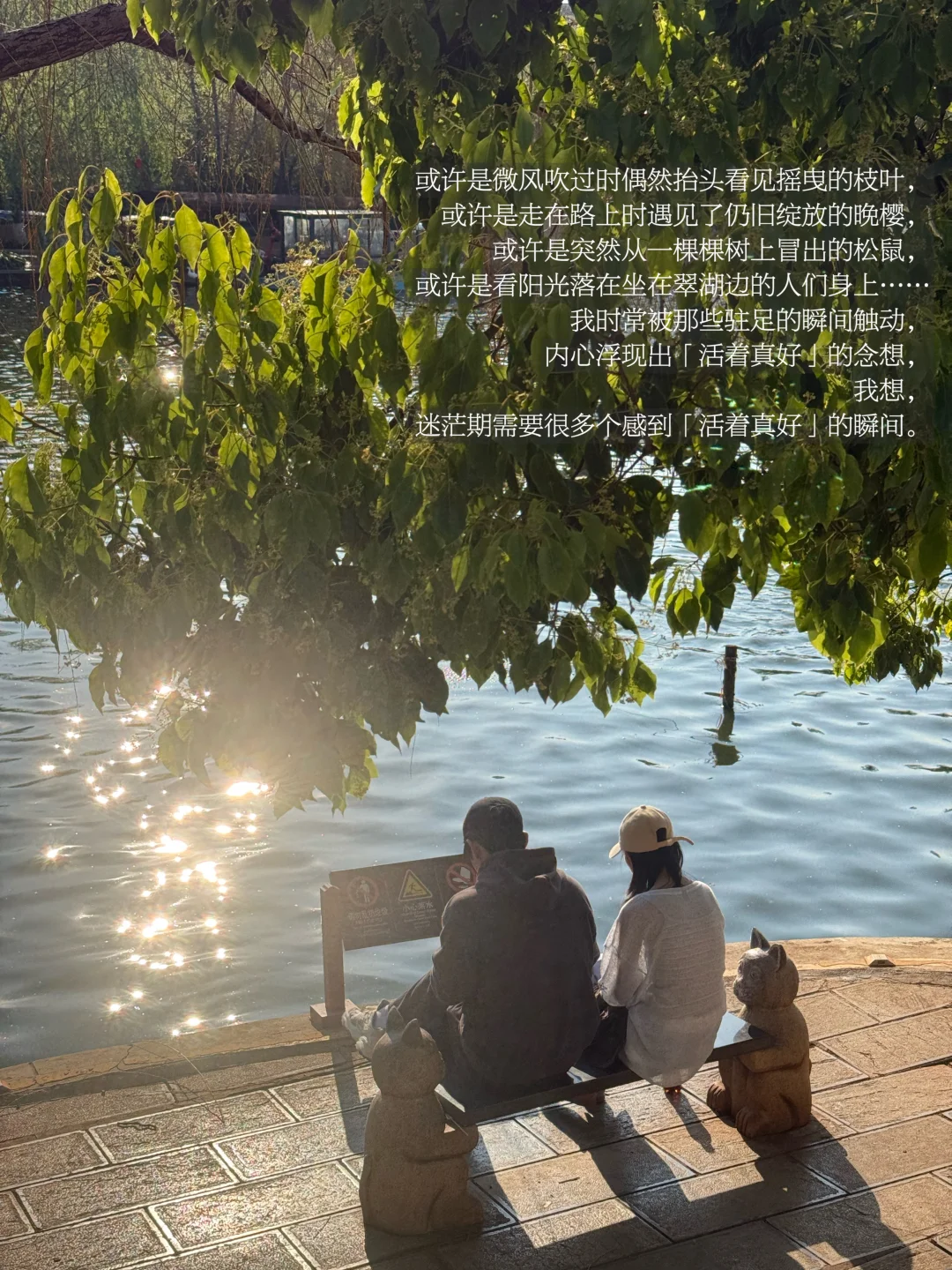 或许是微风吹过时偶然抬头看见摇曳的枝叶,或许是走在路上时遇见了仍旧绽放的晚樱,或许是突然从一棵棵树上冒出的松鼠,或许是看阳光落在坐在翠湖边的人们身上……我被那些驻足的瞬间触动,内心浮现出活着真好的念想。