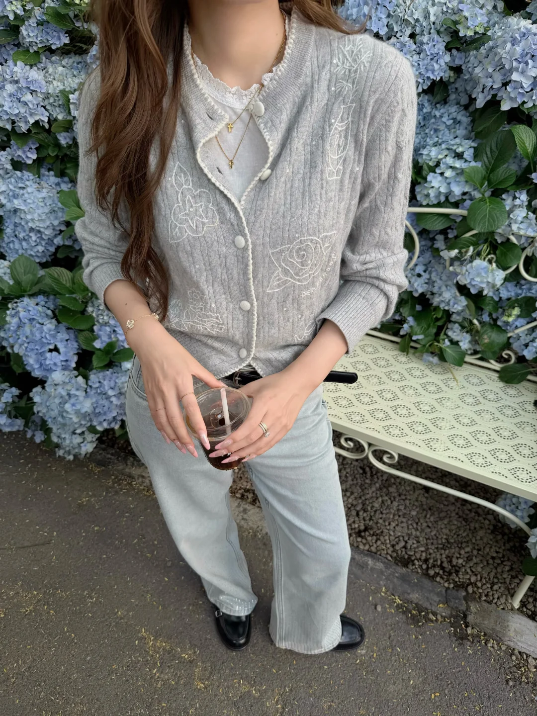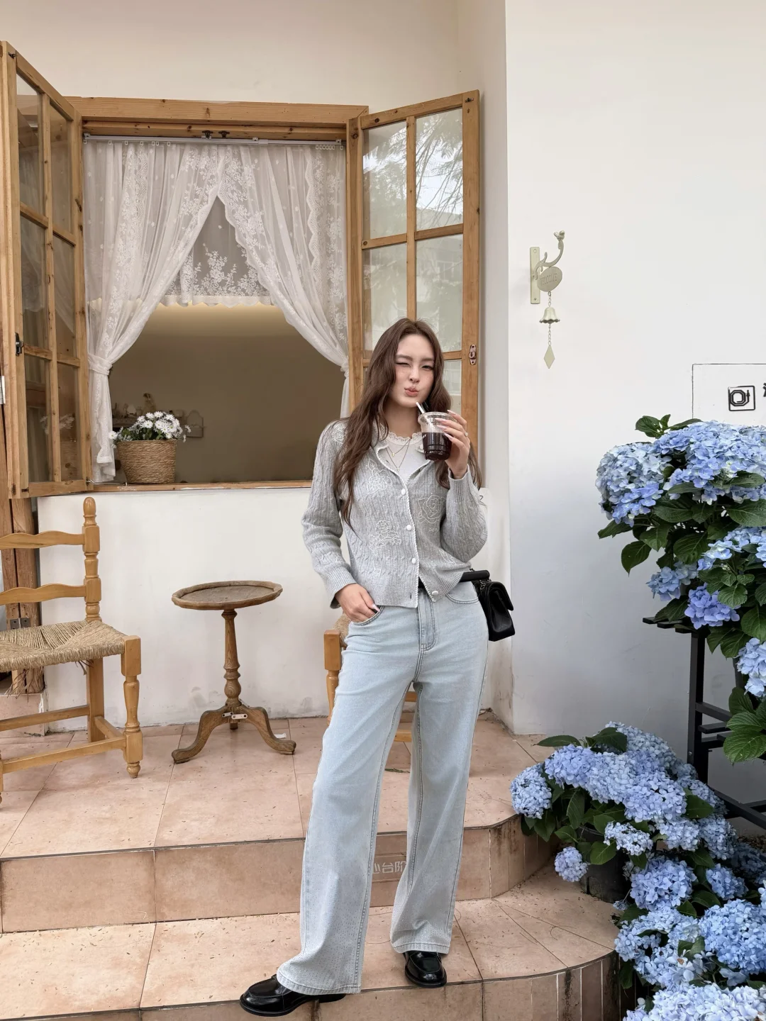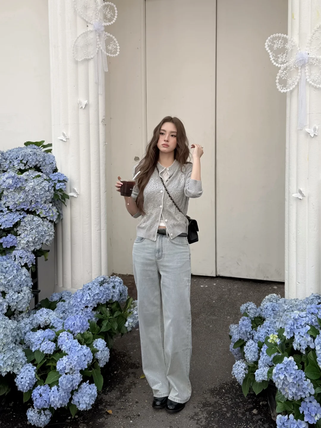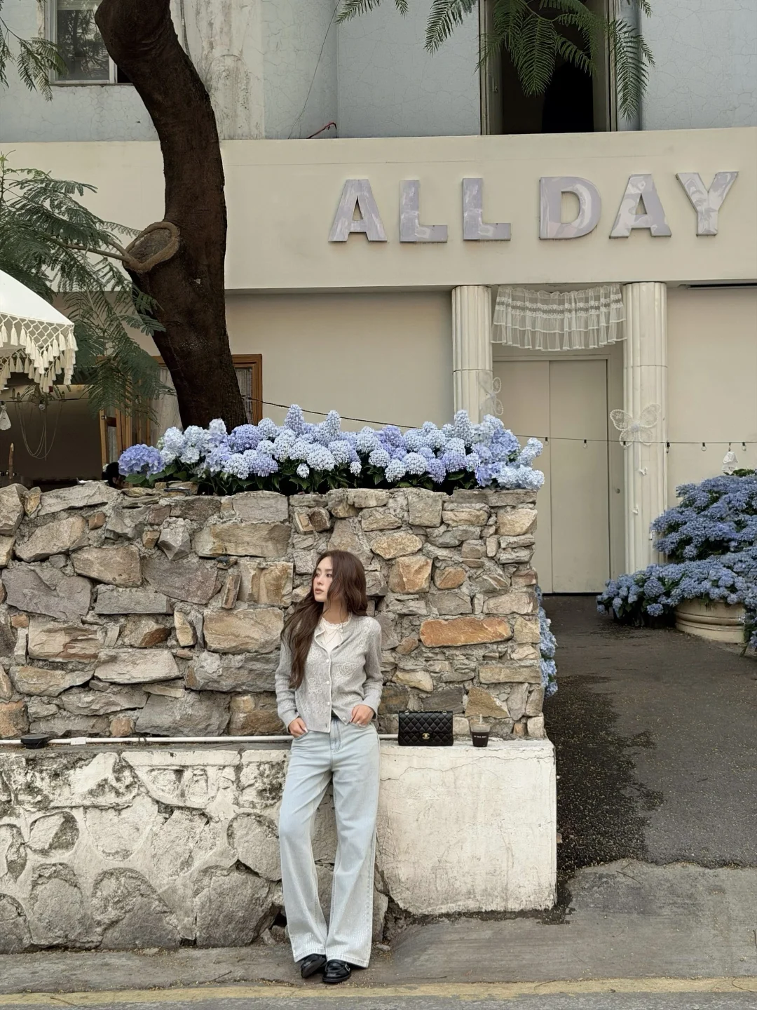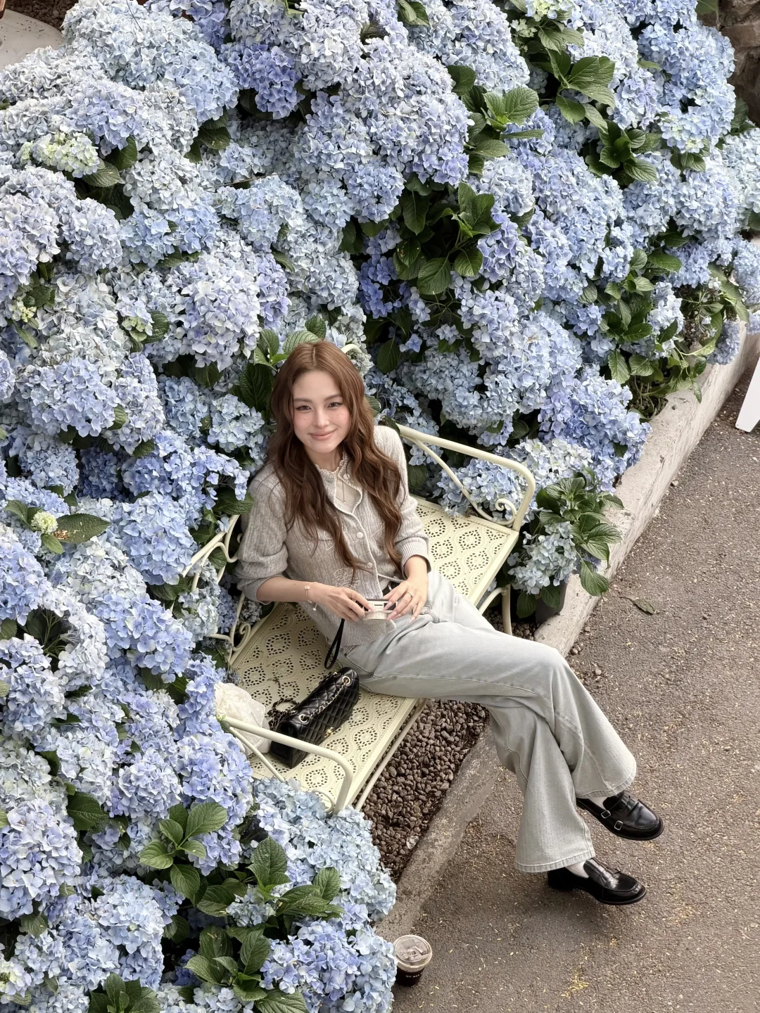 温温柔柔一身 出门过春天咯 趁着微微的太阳☀️ UT ALL DAY绣球花美到爆 浅春色系穿搭可以试试牛仔裤 搭配针织小上衣过度春夏 不用刻意搭配 出门记录春天的美好吧