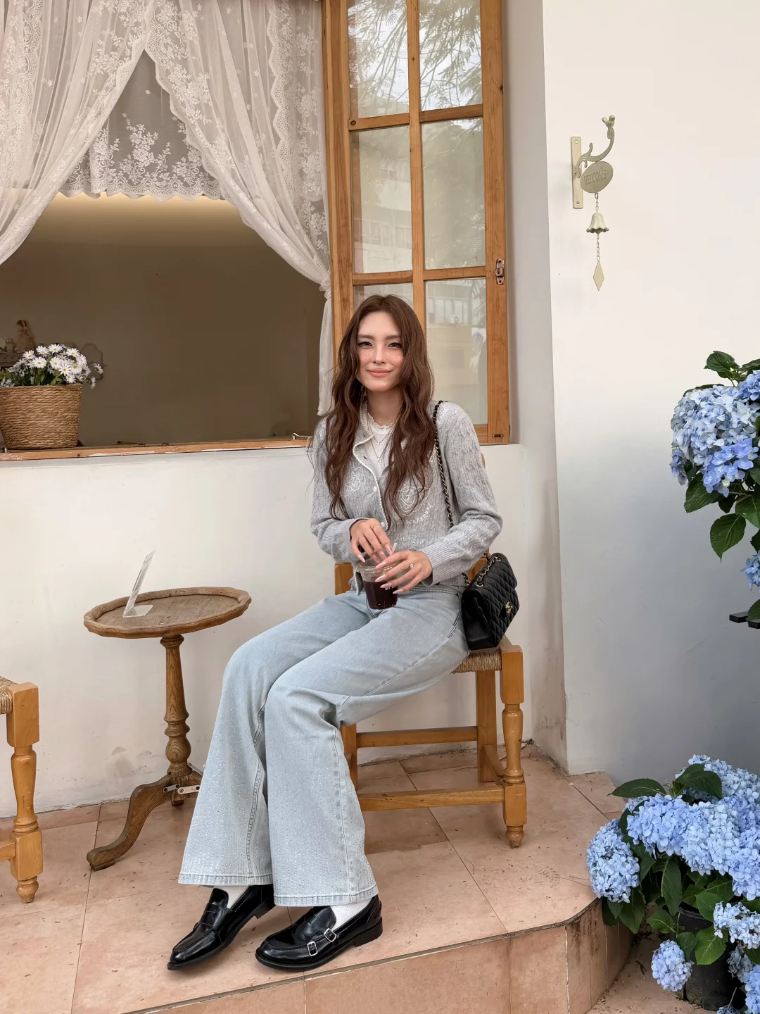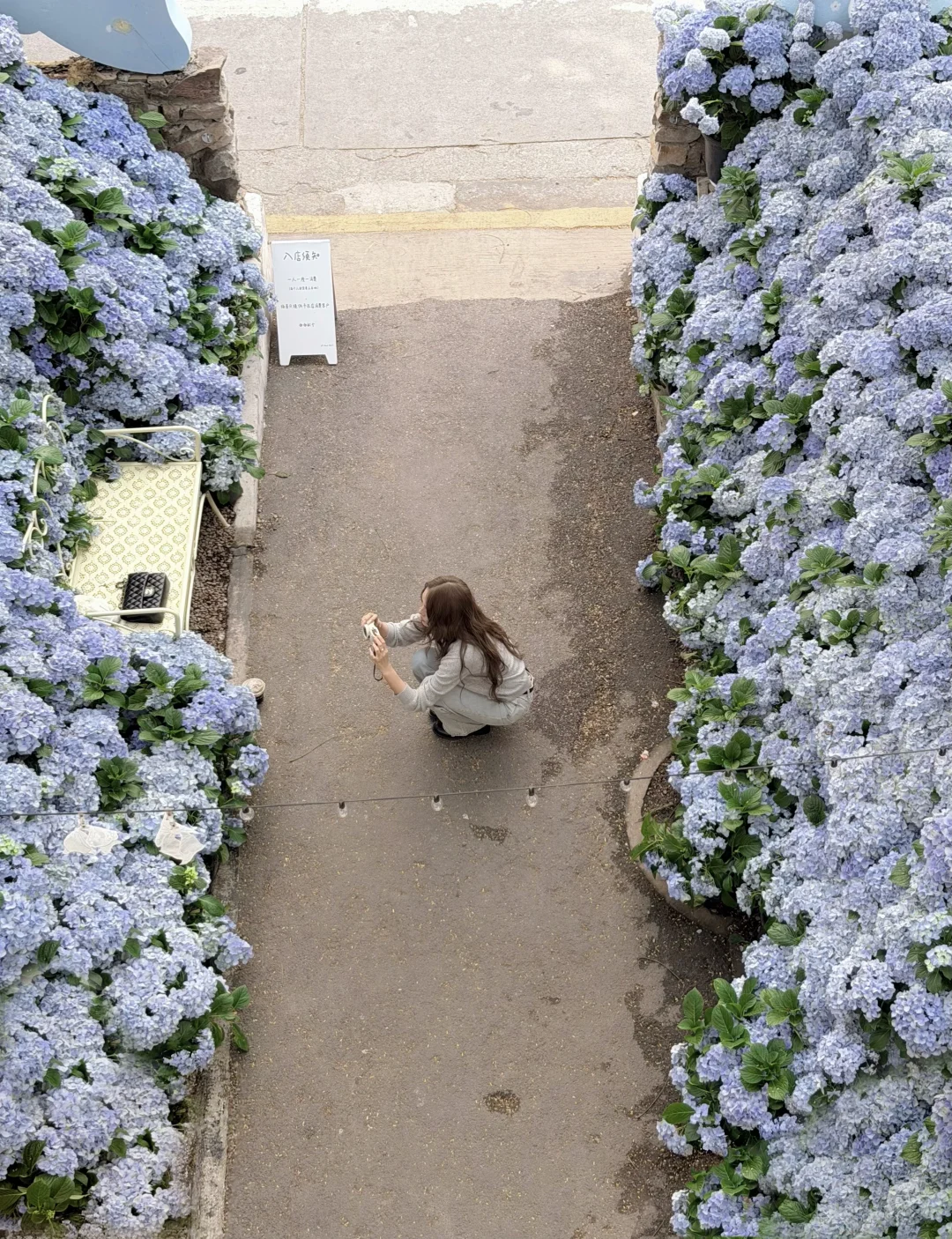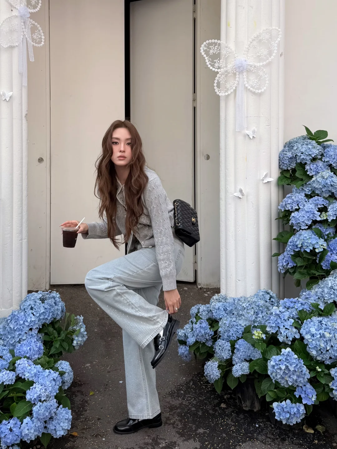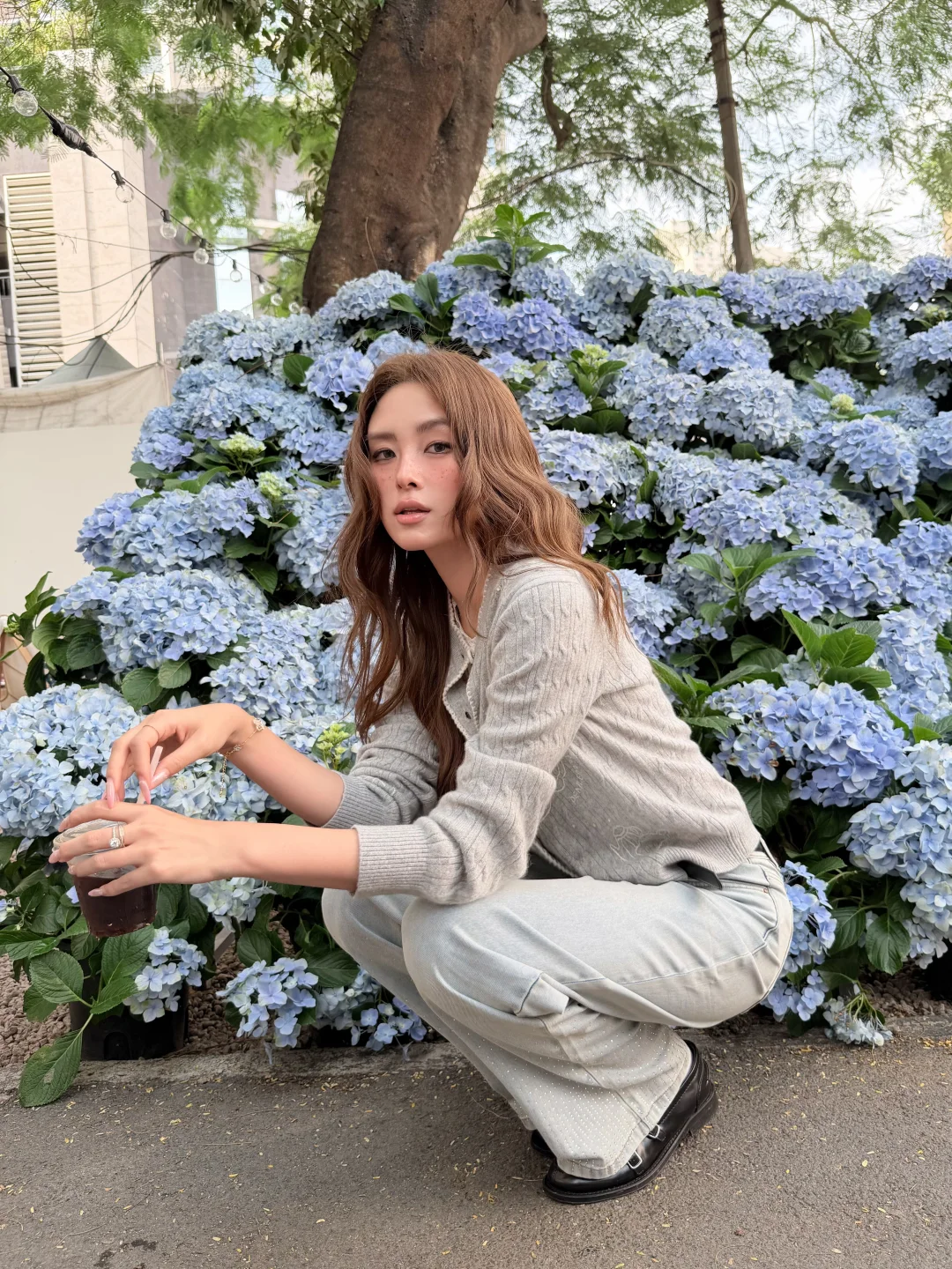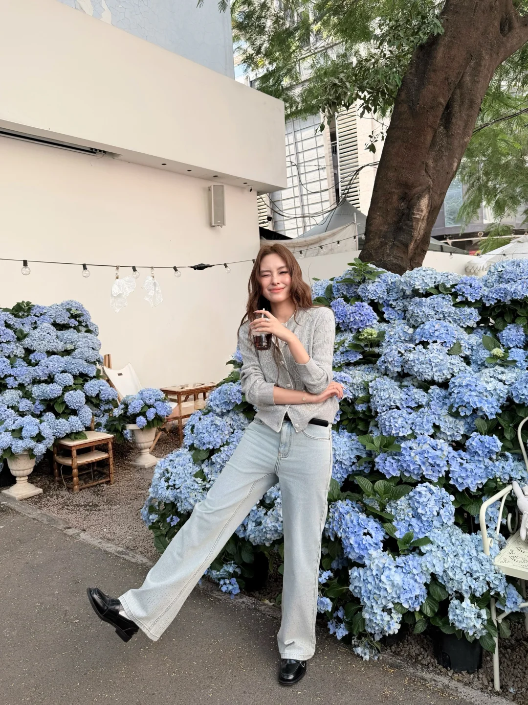 温温柔柔一身 出门过春天咯 趁着微微的太阳☀️ UT ALL DAY绣球花美到爆 浅春色系穿搭可以试试牛仔裤 搭配针织小上衣过度春夏 不用刻意搭配 出门记录春天的美好吧