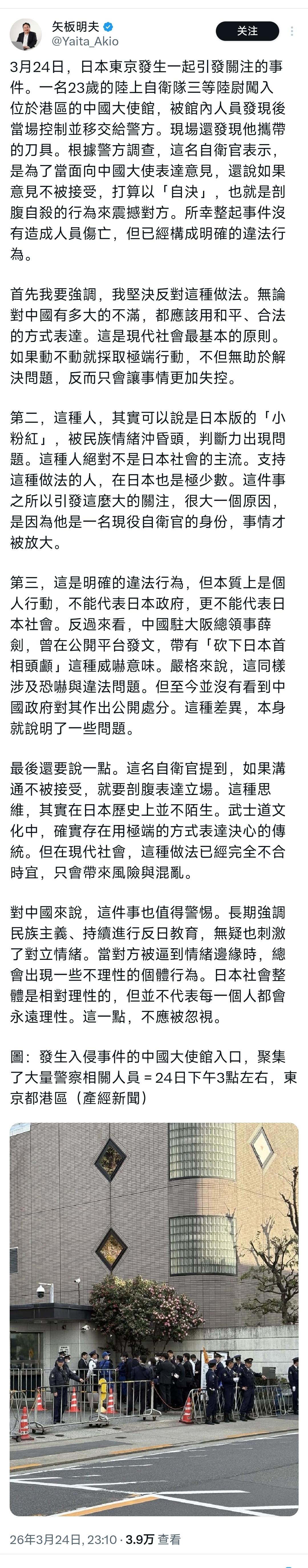 反华分子、日本媒体人矢板明夫昨晚(3月24日晚)写道。“3月24日,日本东京发生一起引发关注的事件。一名23岁的陆上自卫队三等陆尉闯入位于港区的中国大使馆,被馆内人员发现后当场控制并移交给警方。现场还发现他携带的刀具。 2026年3月24日早上九点,东京港区的一栋写字楼四层窗台上,一个年轻人翻过围栏,跌落到中国大使馆的领地。 他叫村田晃大,才23岁,是日本自卫队的三等陆尉。翻墙这件事本身就已经够荒唐了,但当他被安保人员按倒在地时,还被搜出一把十八厘米长的刀。 这个刚入伍一个月的小伙子,怎么敢冲进主权红线呢? 事情得从更早说起,其实早在前一天,也就是3月23日,村田就已经从部队失踪了。 整整24小时,一名带着武器的现役军人在东京的街头消失,自卫队居然没有发现,这不算失职吗? 简直就像把大门钥匙扔给了危险。 被发现后,大使馆应对得很迅速,现场控制住了局面,没有让事态扩大。 然而,日本国内的反应却让人摸不着头脑,事件发生在早上九点,警方却拖到晚上九点才行动,而且抓人的理由居然是“非法入室”,而不是“持械闯入外交机构”或“主权挑衅”。 这种降格处理显然是想把事情压下去,不想让事态升级。 村田自己给出的解释是,他带刀是为了“递意见书”,如果不被接受就准备切腹自尽,听起来很壮烈,但他在翻墙后要求见大使,还提到“天神名义”,怎么看都不像是在谈判,分明就是冲着动手去的。 中国外交部的林剑对此进行了严厉的回应,指出这不仅仅是一起治安案件,更是明显的主权挑衅。 他直接提到了日本军国主义的回潮,一个新兵敢对邻国的外交领地发起这种攻击,背后显然有更深层的原因。 这些年日本政坛的右倾风潮愈演愈烈,极端声音被包装成“爱国”,年轻人耳濡目染,真的以为拿着刀就能为国争光。 林剑的判断切中要害,问题并不只是个别人走极端,而是整个日本武装力量内潜藏的暗流,现役军人能够带刀失踪整整一天而没有人察觉,甚至能翻墙闯入他国使馆,这说明整个体系都存在重大漏洞。 与此同时,有人开始为这一闹剧辩解,矢板明夫发表文章,把村田称为“日本版小粉红”,说这是个别现象,不能代表日本主流。 这种说法无疑是在试图与官方切割关系,同时又借机将责任推给中国,声称中国的威胁性言论激怒了日本民众。 这种逻辑纯属转移视线,一个国家的现役军人持械闯入他国使馆,怎么可能把责任推到另一方头上? 但矢板的手法确实高明,先把村田的行为说成个人行为,再暗示中国的影响,这样既为日本军方洗白,又维护了自己的“理性客观”形象。 至于日本防卫省,他们的回应也只是一句“正在确认”,没有道歉,也没有反省,表现得似乎只是例行公事般的“遗憾”和“关注”。 中方对此当然不会轻易放过。 驻日使馆迅速启动最高级别的交涉,要求日本方面给出明确的解释,这可不是小事,十八厘米的刀,一个失踪的现役军人,以及拖延了十二小时才行动的逮捕程序,层层揭示了日本安保体系的漏洞百出。 归根结底,这件事绝不仅仅是村田个人的问题,一个23岁的新兵敢做出这样的事,背后是整个体系给了他机会,思想上的右倾、管理上的失职和外交上的敷衍,共同构成了更为可怕的现状。 中方已经明确表示,日本必须承担责任,若无法妥善管理自己的军队,就不要怪邻国感到不安。 这次事件不仅是个案,更是一个警示:日本内部的极端思潮正在抬头,今天是一个村田,明天可能就会出现第二个、第三个,如果不绷紧这根弦,迟早会酿成大祸。 至于矢板明夫之类的“洗地文”,听听就好,他们擅长把受害者描绘成肇事者,把系统性的问题说成偶然的叛逆,如果这样的逻辑成立,那这个世界上就没有什么是说不清楚的了。