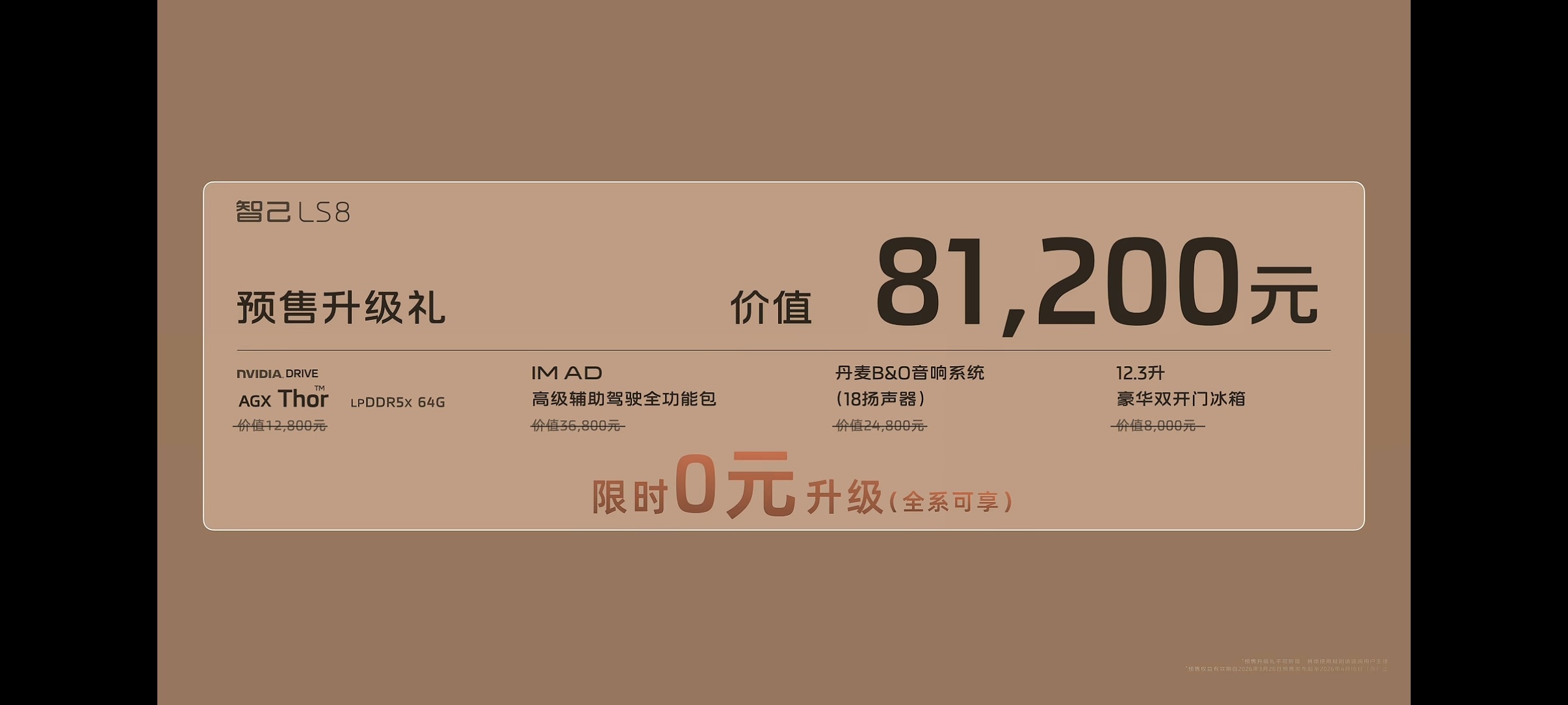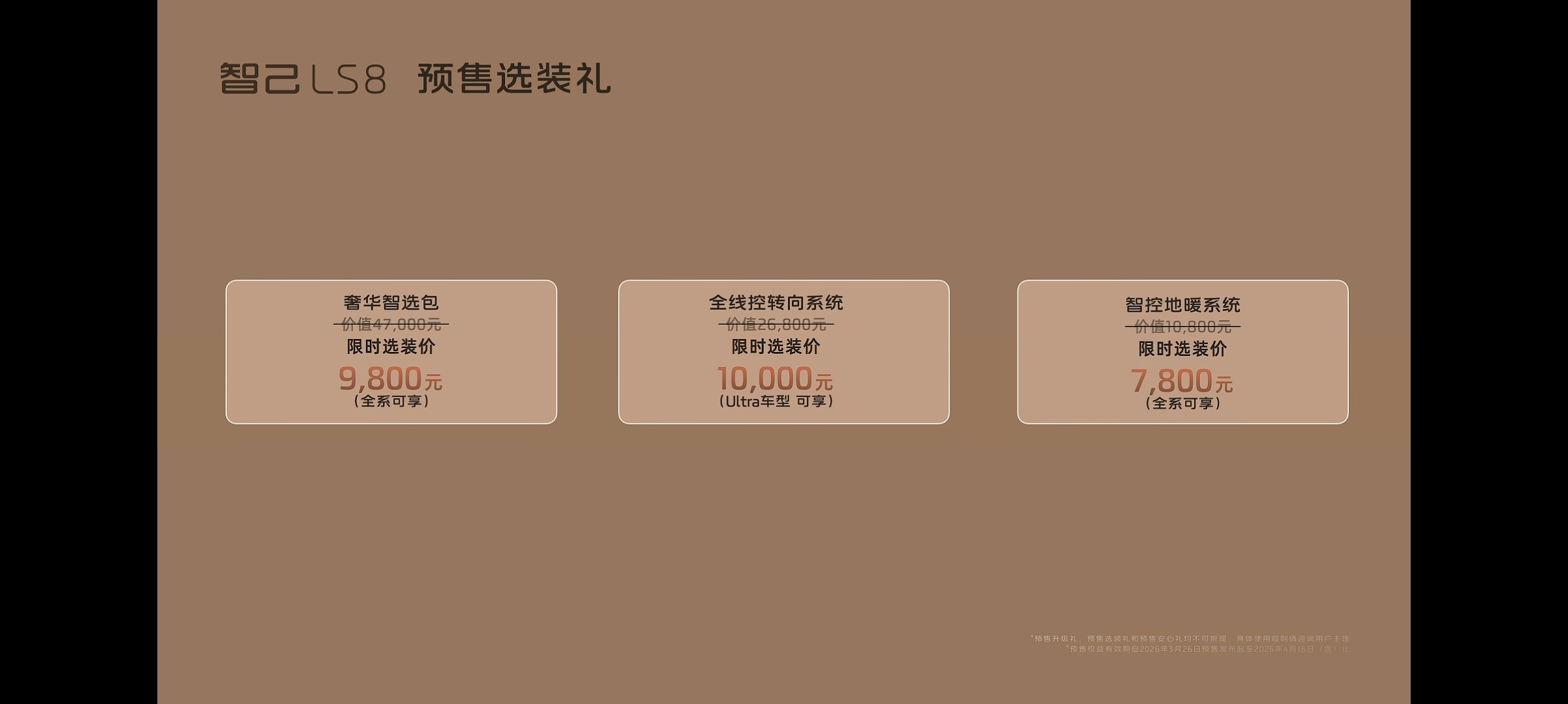 价值8万多的预售升级礼,智能化和舒适配置全系免费升级;预售选装礼,车色和内饰限时免费,线控转向1万元,价值4万7的豪华智智选包9800元,咱们都好奇的地暖价格也出来了,7800元选装。今晚下订提车的时候再送1898元的BO户外音响。