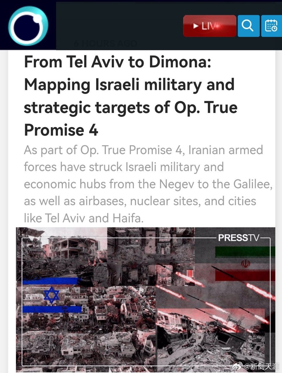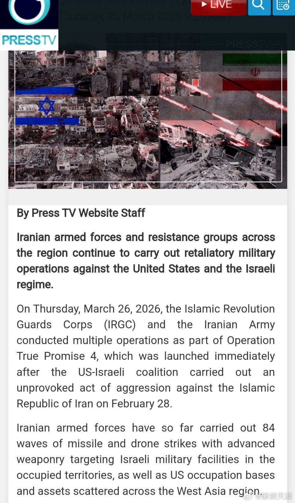 伊朗武装部队迄今已发动了 84 次导弹和无人机袭击行动,使用了先进的武器装备,目标是被占领地区的以色列军事设施,以及散布在西亚地区的美国占领据点和资产。(伊朗新闻电视台)