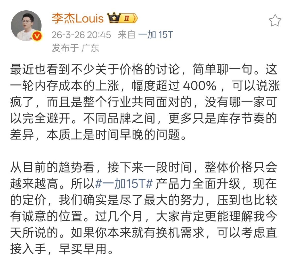 李杰再次解释了一加15T的定价,能看的出来确实没办法了。