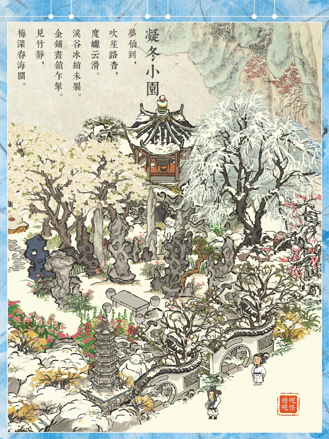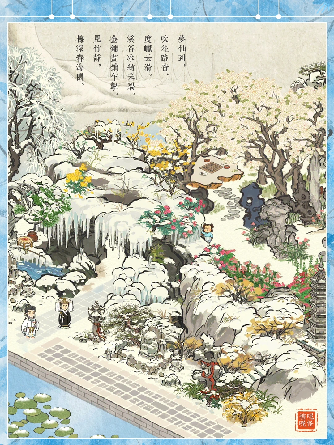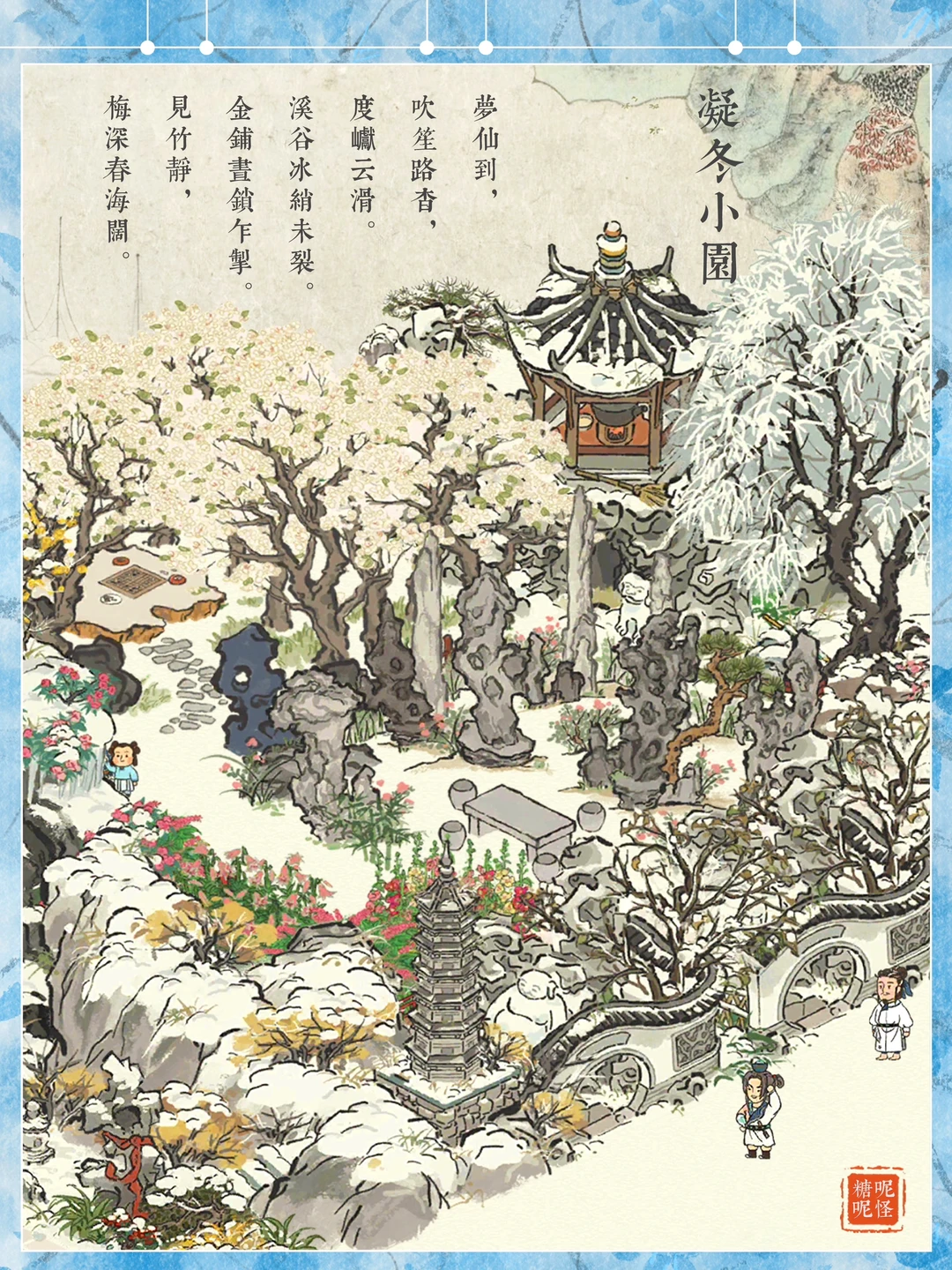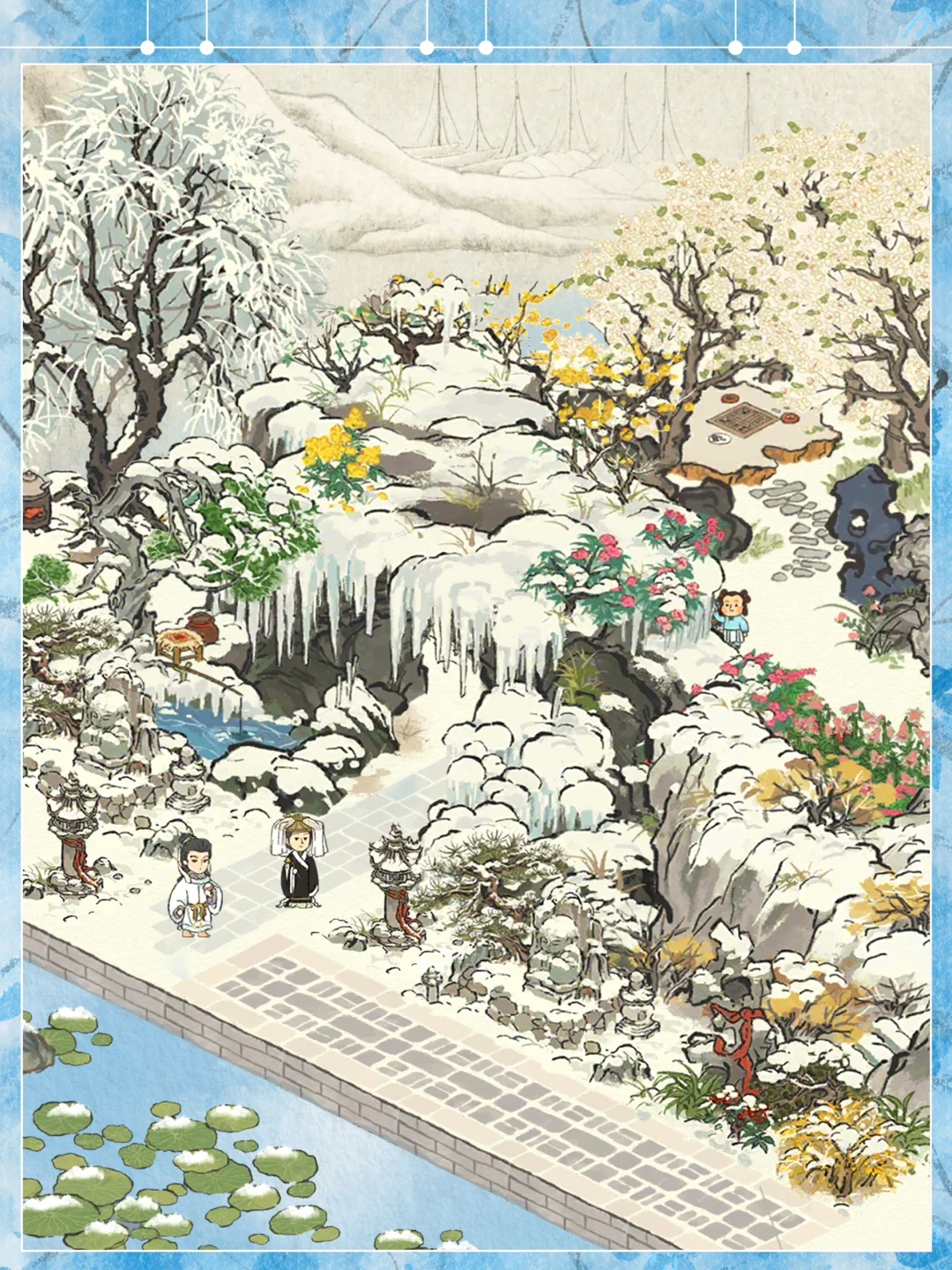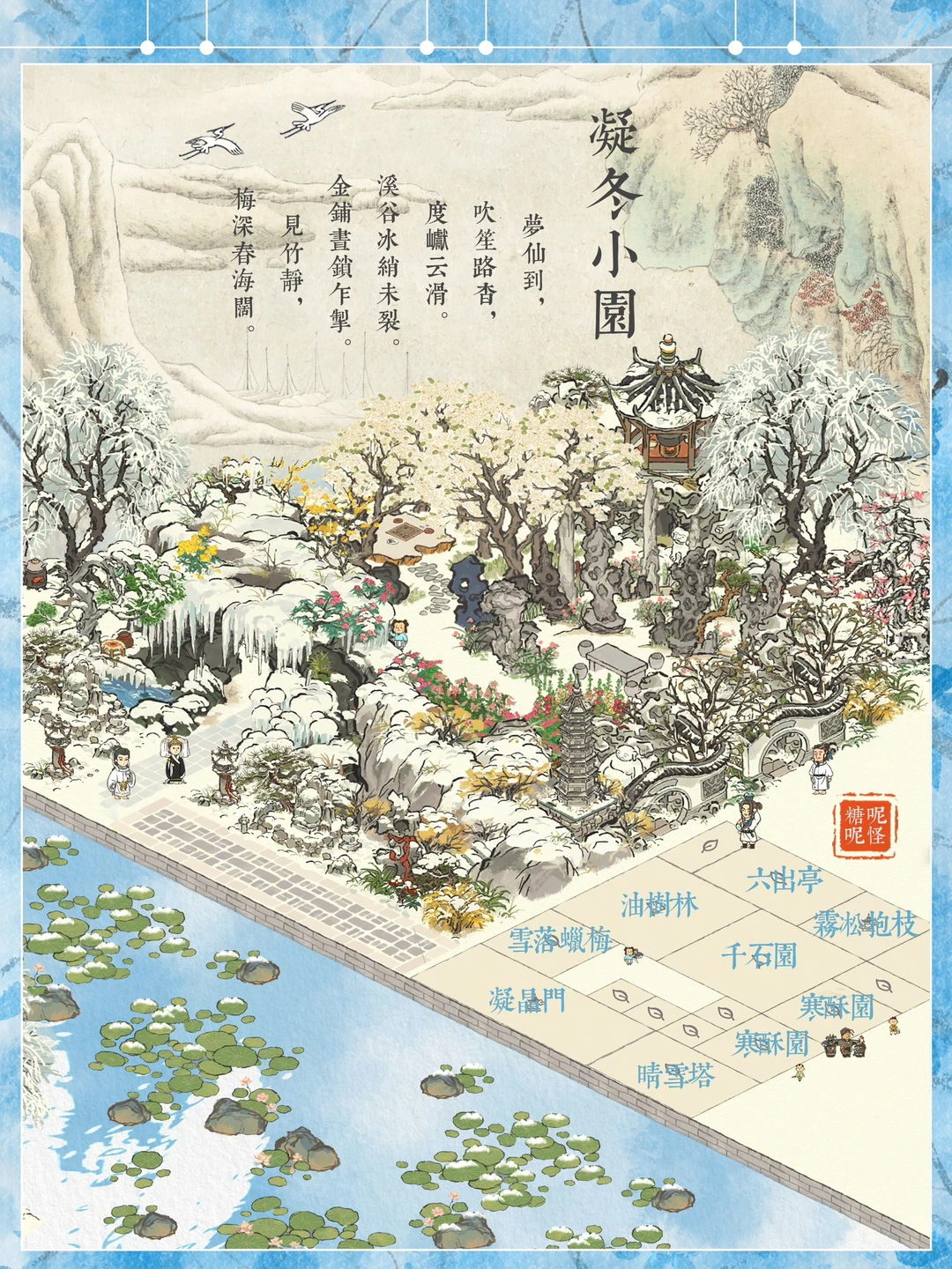 终于拿到了【凝晶门】,那就布置一个穿门而入的小园吧! 【凝晶门】外,一位独钓的钓者刚离去不多时……小凳上的雪才刚刚落上,尚未成堆积之势…… 穿过【凝晶门】,可前往【油树林】中小坐;亦可往千石园而去,园中石景雅致,其间也有小座,可休憩观雪…… 再穿过【千石园】,来到一棵雾凇大树,增添冬日胜景;旁边湖石拾级而上,来到园中【六出亭】,可俯瞰全园,极目远眺,才看到,凝晶门上已经有春花暗自盛开了……不禁感慨,冬天已经来了,春天还会远吗? 游园结束,可由【寒酥园】离园……