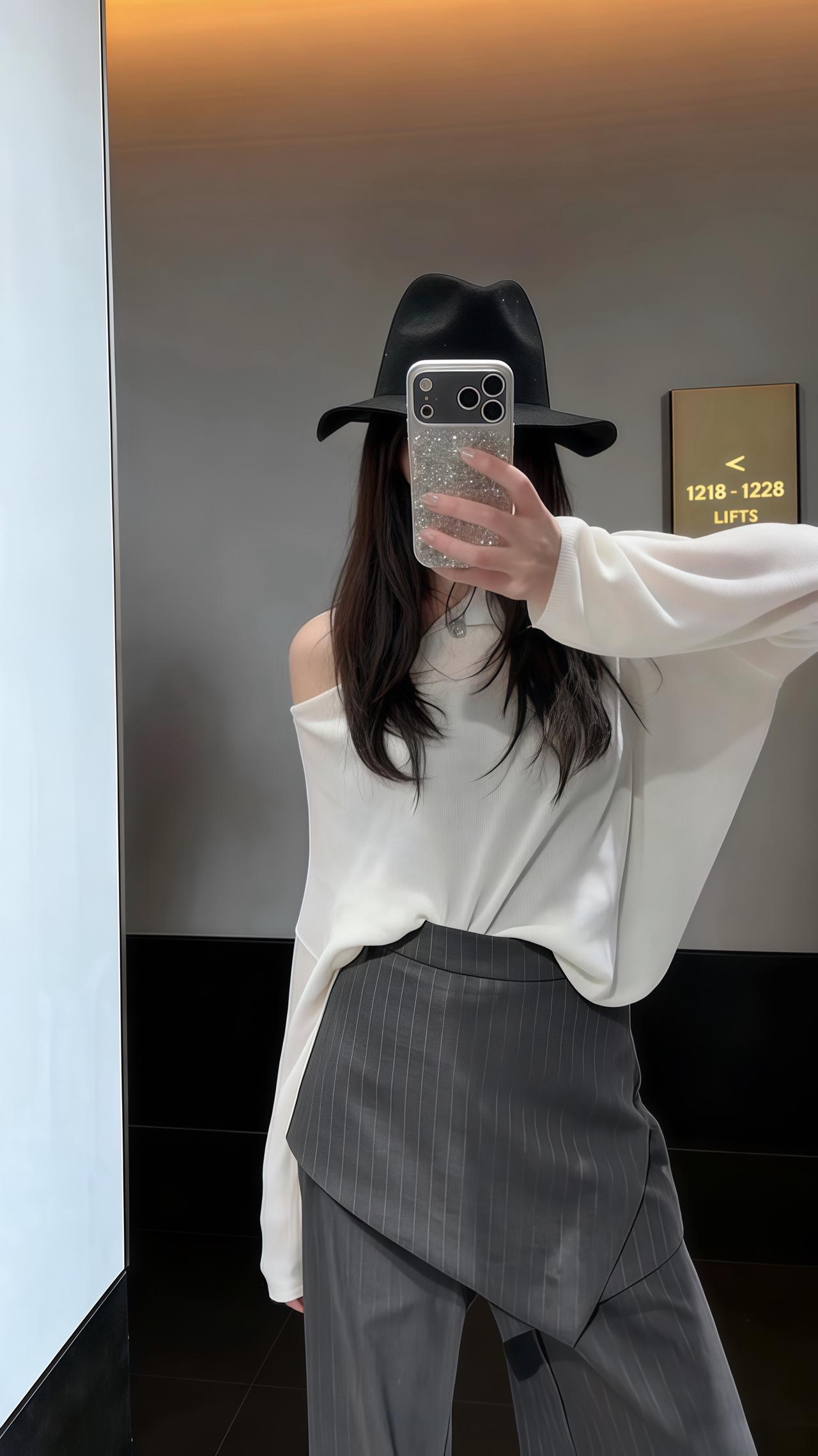 极简穿搭小众穿搭露肩上衣搭配阔腿裤拽姐穿搭爆款斜肩上衣