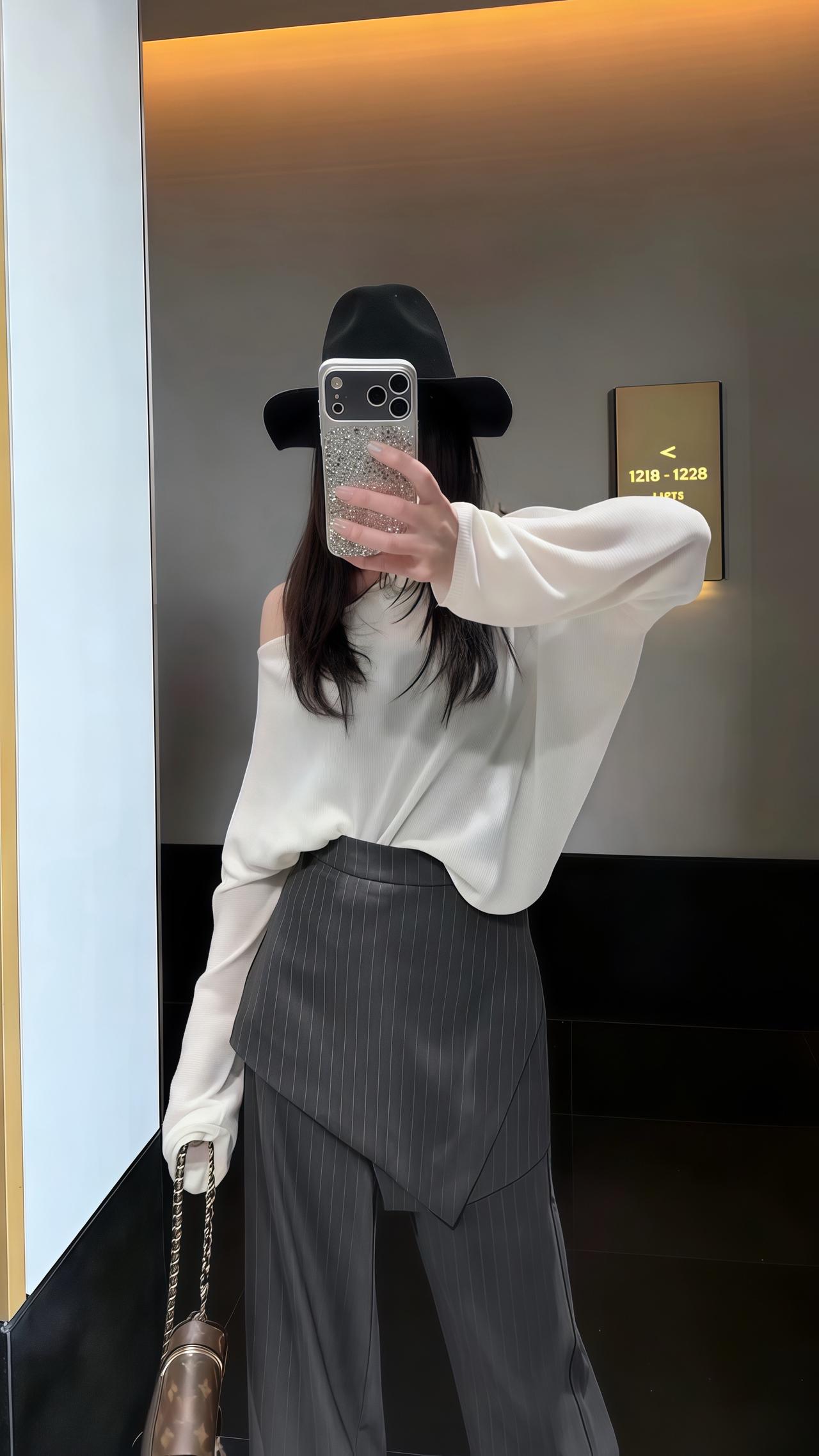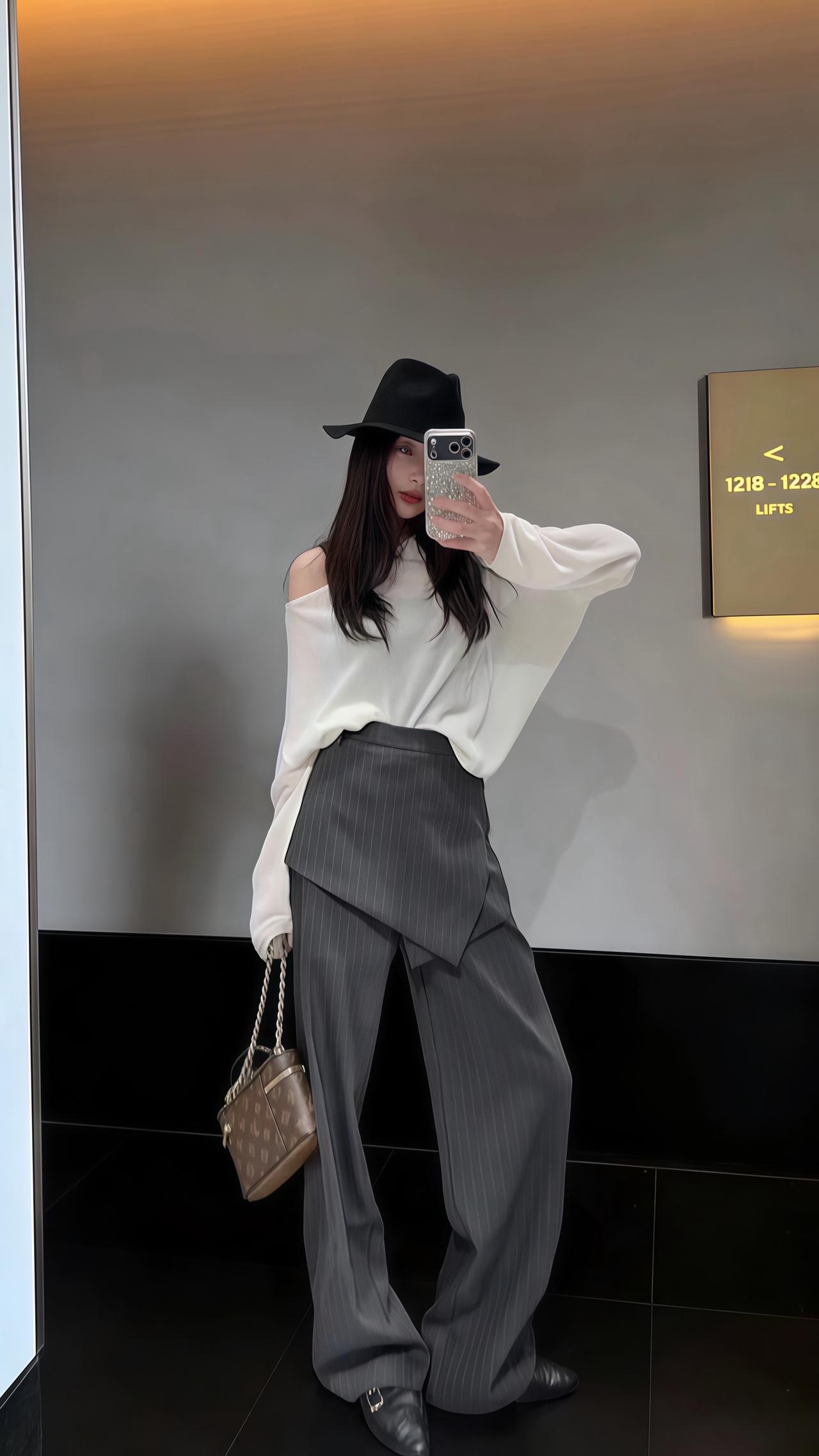 极简穿搭 小众穿搭 露肩上衣搭配阔腿裤 拽姐穿搭 爆款斜肩上衣