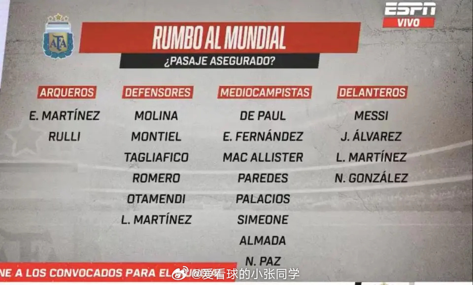 北京时间3月26日,来自ESPN阿根廷版的报道,尽管距离世界杯开幕还有78天,但阿根廷世界杯26人参赛名单已经基本确定。据悉,斯卡洛尼已经提前锁定了20名球员参加世界杯,只剩下最后6个名额,将由16名球员展开激烈争夺。已锁定世界杯名单的16名球员分别是:门将:大马丁、鲁利后卫:莫利纳、蒙铁尔、塔利亚菲科、罗梅罗、奥塔门迪、利马中场:德保罗、恩佐、麦卡利斯特、帕雷德斯、帕拉西奥斯、小西蒙尼、阿尔马达、帕斯前锋:梅西、阿尔瓦雷斯、劳塔罗、尼古拉斯·冈萨雷斯这16人当中,除了梅西和德保罗,基本都是效力于欧洲主流联赛的球员,并且大多数都是球队4年前问鼎世界杯的冠军核心成员。而16名球员争夺最后6个席位,分别是门将:穆索、贝尼特斯后卫:阿库尼亚、罗哈斯、巴列尔迪、塞内西、梅迪纳中场:马斯坦托诺、洛塞尔索、佩罗内、苏莱、巴尔科前锋:何塞·洛佩斯、帕尼切利、普雷斯蒂安尼、卡斯特拉诺斯其中身价4500万欧元的皇马天才马斯坦托诺和身价2500万欧元的法国法甲新星帕尼切利,能否把握住这次国家队热身赛机会,搭上末班车值得关注。值得注意的是,身价4000万欧元的加纳乔,因为本赛季在切尔西状态平平,再加上性格问题,这位为阿根廷国家队踢了8场正式比赛的21岁昔日天才,基本提前确定无缘美加墨世界杯。