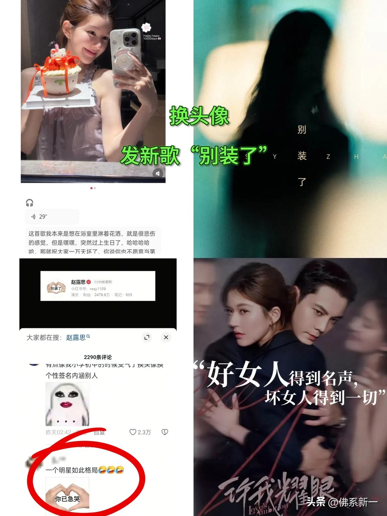 你说惹她干嘛[捂脸] 26岁赵露思换头像“别装了”,吃瓜网友以为是平台活动邀请虞书欣,没请她,她矫情 结果人家第二晚水灵灵的宣布出新歌了 新歌歌名就叫“别装了” 也是小女王巧施连环计,小黑子误上断头台了 《许我耀眼》许妍女王台词还是太超前了 真不是赵露思格局小啊! 她只是美美预告全网宣传自己新歌《别装了》 从好运的柚子叶头像,到宣传新歌,赵露思真的活人玩网啊