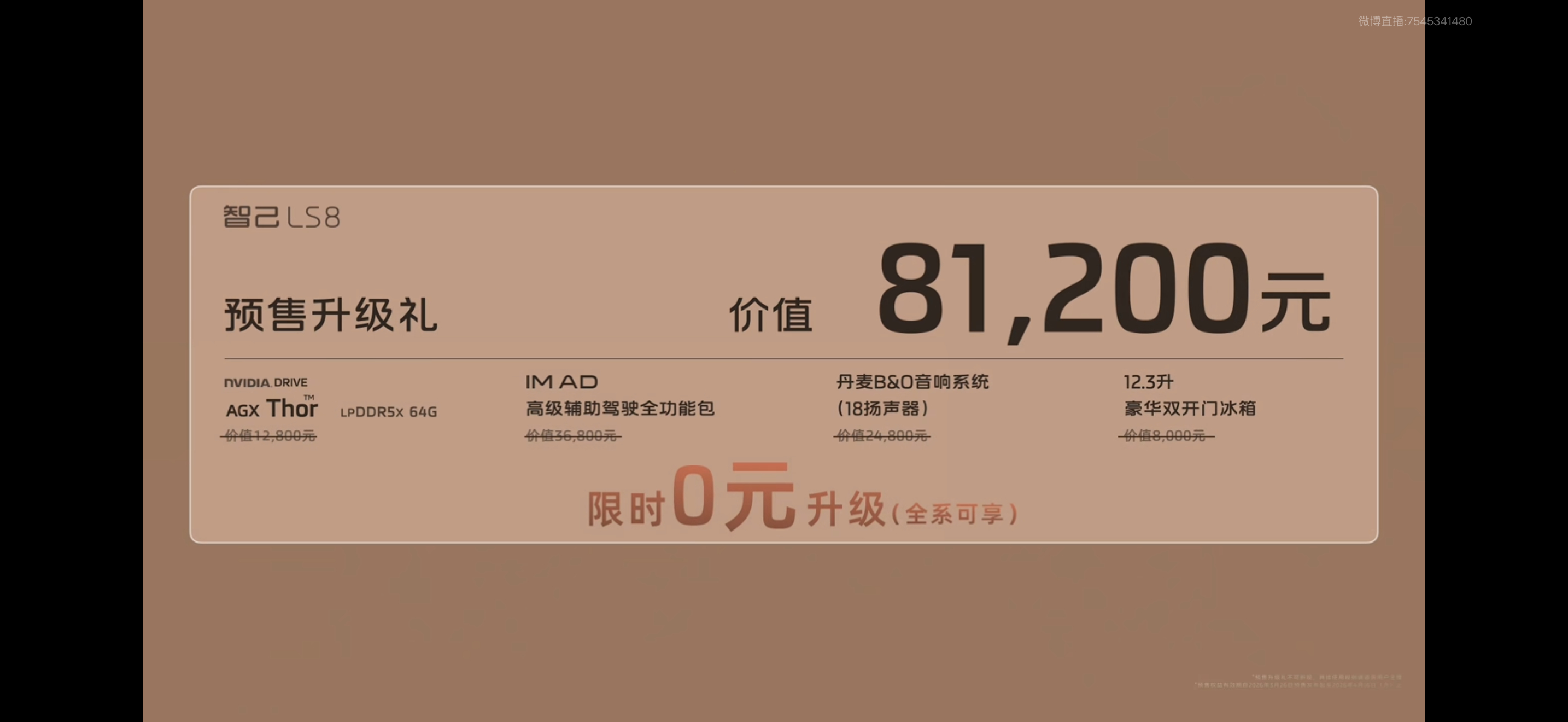 智己LS8 52Max+大五座 预售权益价25.98万 66Ultra大五座 28.98万 52Max+大六座 27.98万 66Ultra大六座 30.98万关键是全系限时0元升级价值81200元的配置,朋友们,心动没有~