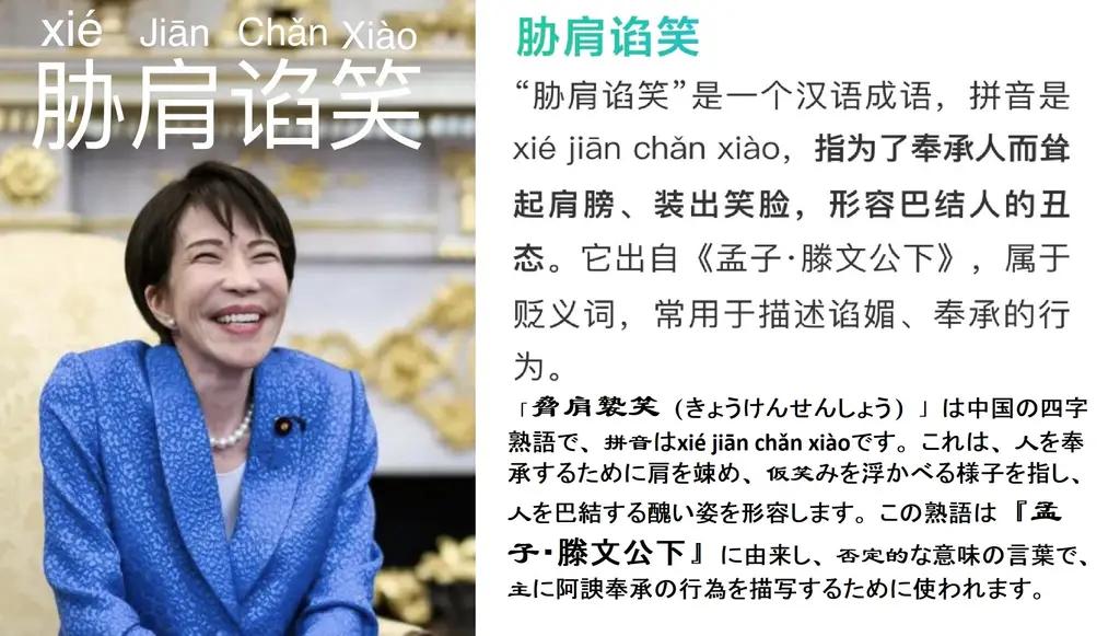 高市早苗在美国极尽谄媚,可她最大目的完全没实现! 高市早苗抢在美国总统来我国之前和他见一面,最大目的是让美国在中日之间的争端中支持日本。 高市早苗为了达到这个目的,在美国毫不顾及脸皮,极尽谄媚,甚至到了令人作呕的地步。 我国有个成语“胁肩谄笑”完美形容了她的样子,出自几千年前的《孟子》一书,没想到在今天具象化了。 不过,最终的现实是美国总统不但没表态支持日本,反而提了珍珠港。 可以说这一趟美国之行,高市早苗什么都没有得到,除了丢人现眼!