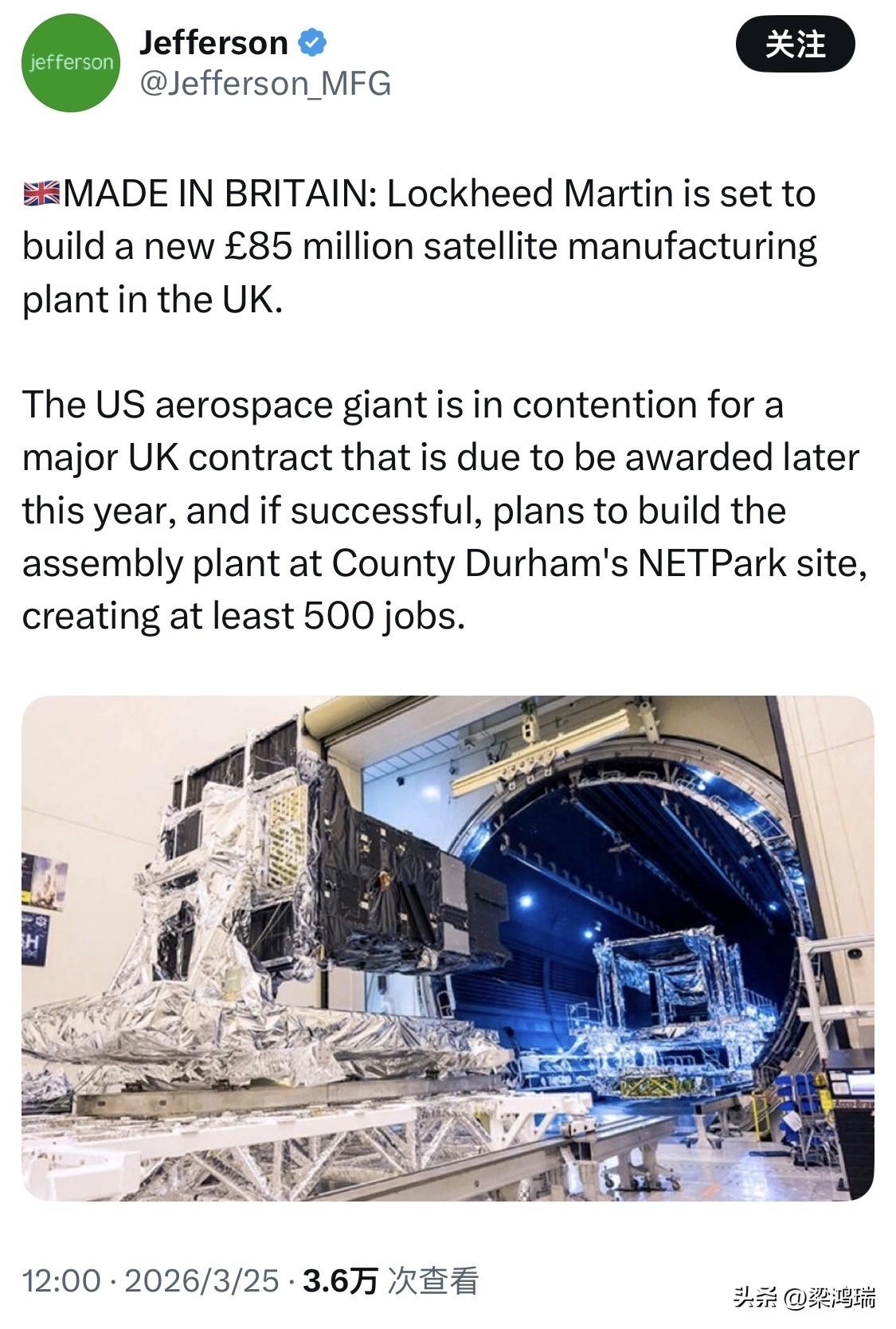 英国制造:洛克希德·马丁公司将在英国建造一座价值 8500 万英镑的新卫星制造厂。 这家美国航空航天巨头正在竞标英国一项将于今年晚些时候授予的重大合同,如果成功,该公司计划在达勒姆郡的 NETPark 园区建造组装厂,创造至少 500 个就业岗位。