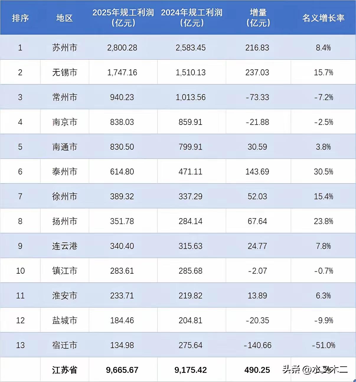 工业 江苏 老徐依旧稳坐苏北头把交椅。2025年,江苏省规模以上工业企业利润总额高达9665.67亿元。苏州规工利润达2800亿元,一市干到近全省三分一的。前四名皆为苏南城市,这也不足为奇。 徐州规工利润389亿,名义增速达15.4%,位居全省第7,无疑是苏北老大,不过仍逊色于泰州。连云港以340亿排名第9,增速7.8%。淮安233亿排名第11,增速6.3%。 而盐城、宿迁的情况就颇为惨淡了,规上工业利润在全省处于垫底位置,且名义增速均呈负增长。宿迁的利润降幅超一半。苏州对口帮扶宿迁,一个是正数第一,一个是倒数第一,泾渭分明。 苏州 宿迁 盐城 淮安