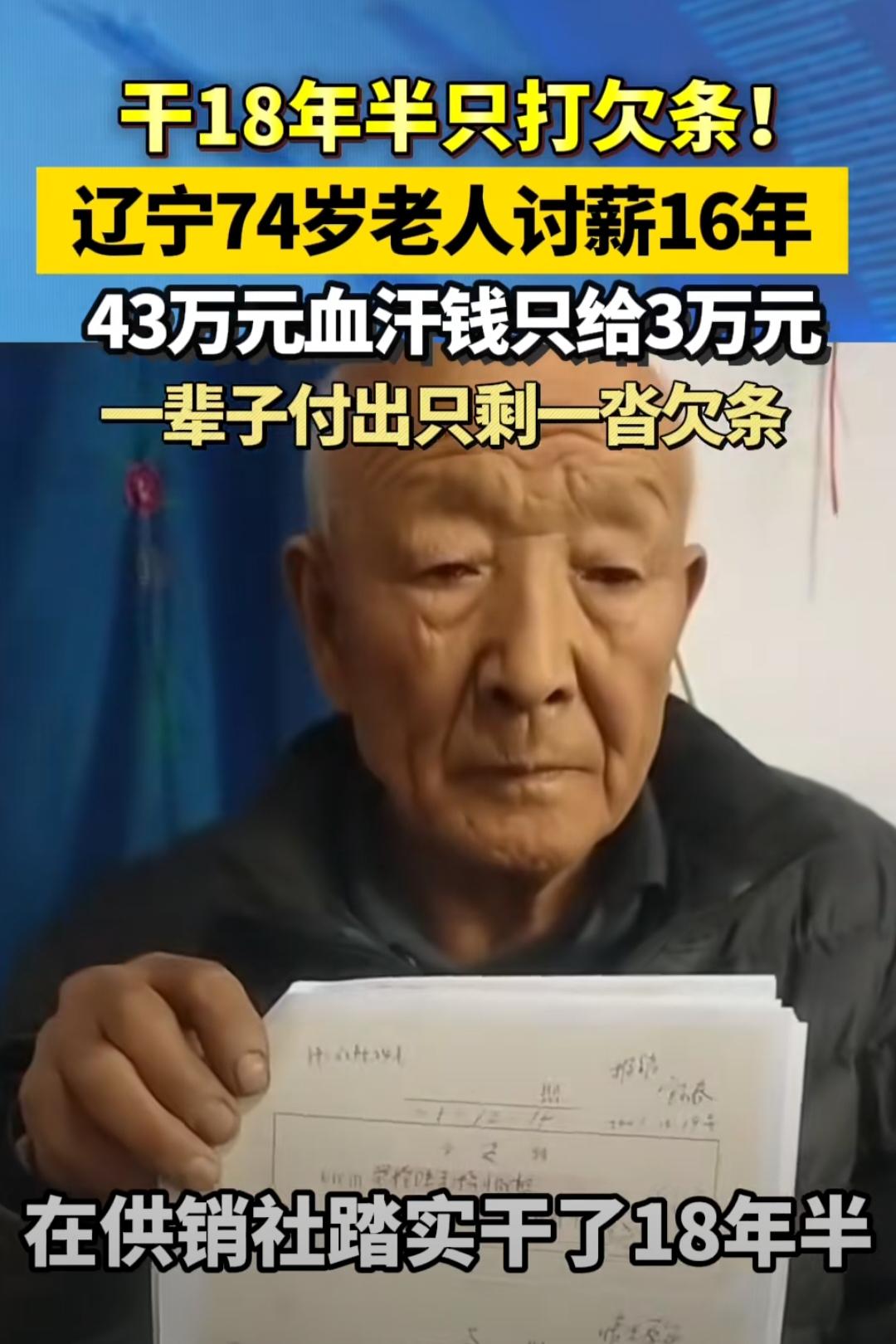 见过拖欠工资的,但是你见过拖欠222个月,多达43万多元工资的吗? 辽宁省74岁的王朝文老人,辛苦工作了18年半,被拖欠了222个月的工资,累计费用多达43万多元。222个月正好18年半,也就说王朝文老人从开始工作到结束,一个月的工资也没拿到。 “工作了18年半,不发工资,只打欠条,如今欠条在手却难兑现”,面对媒体,王朝文老人的女儿王女士无奈的说道。 据王女士讲述,父亲王朝文于1993年调到“辽宁省凌原市三十家子镇供销合作社”工作(后文简称供销社)。不过自从到了供销社,应得工资一直是以“欠条”的形式拖欠,这一欠整整就是222个月工资。按照2012年朝阳市的工资标准,已经高达43万多元。 经过漫长的讨薪仍无结果后,王朝文老人在2010年向法院提出诉讼。 然而,在2013的二审中,却只判决供销社支付王朝文老人其中3年(1997年至1999年)的工资。原因是“双方劳动关系存续,但因改制、‘待业协议’等因素存在中断争议,部分诉求超过诉讼时效”。 二审之后,王朝文老人表示不认同这样的判决,并坚持向多个部门反映此事。 到了2018年,在王朝文老人的坚持下,在当地多个部门的协调下,供销社曾认定了王朝文工作18年半一事(时间从1993年3月到2011年9月),并相互约定核算所欠工资。不过,事后一直没有执行。 从2022年开始,王朝文老人学着利用网络去实名举报被拖欠工资一事。 2024年到2025年,当地多方部门,也对此事进行了多次会议协商,并提出按朝阳市2012年的工资标准,计算王朝文老人被拖欠的工资。 根据这个标准,王朝文的女儿王女士表示“仅工资、加班费、安全奖等劳动报酬及垫付的费用就达到了43万多元。要是再加上多年维权所用的交通、误工等费用及精神损失费,已经累计达到78万多元。” 因此王女士表示,曾同意协商到50万元了事,但是这个数字却没能让各方达成一致意见。 2026年2月,供销社一方出于各种压力,承认了对王朝文的部分欠款,不过认可的仅有工资、困难补助、买断费各1万多元,并再次提出用3万多元解决此事,但因与王朝文一方核算的金额相差太大被拒绝。 2026年3月20日,接到媒体的电访后,供销社的工作人员表示:以前打算按判决结果支付给王朝文3年工资,但是被他拒绝了。 对于2018年协调时的承诺,这名工作人员表示:因各方没能达成统一意见,当时的约定未能落实执行,也没有法律效力,不能作为拖欠工资的证据。 2026年3月23日,有媒体致电当地镇政府,想了解事情目前的情况,但被工作人员拒绝了。工作人员表示此事法院已经有判决结果,有问题可以直接询问王朝文本人即可。 目前,事情还未得到圆满的解决,王朝文老人的讨薪之路还将继续走下去!