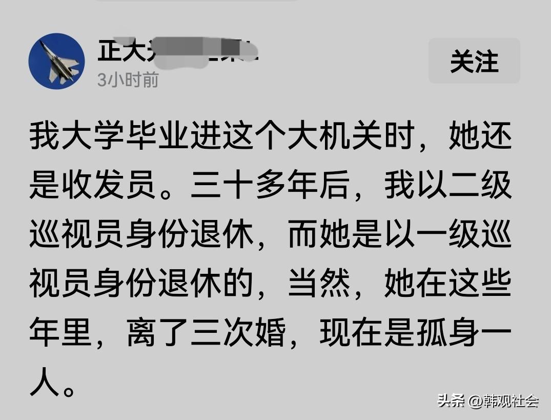 一位网友发帖爆料:三十年前,他大学毕业进某大机关时,单位里有一位文化程度不高的女同事还是收发员。经过他个人的努力,如今,他以二级巡视员身份退休,按说进步够快了。 然而,那位干收发员的女同事比他进步更快,是以一级巡视员身份退休的。当然,在这些年里,他那位女同事曾经离了三次婚,现在仍然是孤身一人。 实在不理解:女人离三次婚与进步快有什么关系呢?难道说女人想在事业上成功就不能有爱情?莫不是单身女人提拔的更快?