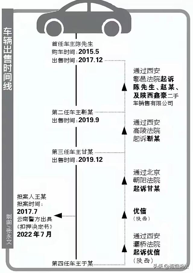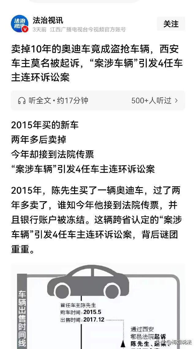 陕西西安,陈先生11年前花190000元买了一辆奥迪,两年后卖给了二手车行,2026年1月初,陈先生突然接到了一张传票,称他当年那辆车是偷的,还把他的账户冻结了。陈先生气坏了:我在4S店提的新车,怎么可能是偷的? 说起这件事,陈先生就一个头两个大,莫名其妙出现的这场官司,将他的生活彻底扰乱了。 2015年陈先生只有39岁,当时他赚了一笔钱想买辆新车,挑来挑去,陈先生最终决定买辆奥迪。 当年的5月份,陈先生从某4S店买了一辆全新车,总价19万,车子到手后,陈先生按照规定办了牌照等手续。 新车到手,陈先生着实兴奋了一段时间,可开了没多久,陈先生就发现这辆车养起来真费钱。 两年半后,也就是2017年的12月份,陈先生决定换一辆车,当时将车卖给了一个二手车行,陈先生提供了之前买车的手续,双方签了《旧机动车交易协议书》。 转眼间过去了9年,陈先生早就把这件事忘了,可2026年的1月份,他突然接到了一张传票,一个叫荆某的把他告了,同为被告的,还有一个叫赵某的,以及他当年卖车的那家二手车行。 陈先生懵了,这个荆某他根本不认识,怎么会起诉自己呢? 经过进一步了解,陈先生才知道这是怎么回事。 原来陈先生的车卖给二手车行之后,车行又将车子转给了赵某的车行,赵某又将这辆车卖给了荆某。 荆某开了一年半,将车卖给了另外一个人甘某,甘某开了一段期间,又于2019年,通过一家公司转卖给了天津的于某。 最后一任车主于某使用车辆期间,按照惯例去审车,结果不能审核。 过不了审的车怎么敢开?当时于某买车花了152155.16元,他认为自己被骗了,立即报了警。 通过民警调查,于某这才知道早在2017年7月18日,云南昭通有个男子报警,称他的车被偷了,被偷的车的识别号和发动机号与这辆奥迪车一模一样。 随后,这件案子在昭通立了案,于某去年检的时候,自然就过不了审。 云南那边经过核对,确认于某这辆车就是云南被偷的那辆车,这辆车就被扣押运回了云南昭通,失主现场辨认后,确认是他丢的那辆车,车子也就返回给了他。 可如此一来,于某的15万多元不就白花钱了吗? 于是,于某反过来告了卖给他车的某公司,某公司又反过来起诉卖给他车的甘某,甘某又起诉上一个车主,大家一个接一个往上起诉,最后就找上了陈先生。 陈先生目瞪口呆,这样一来看似很合理,可问题是他当年买的并不是二手车,而是去4s店提的全新车!全新车怎么可能是被偷来的呢? 另外,云南那辆车被偷的时候,这辆车他还一直开着呢!也就是说,他买车早于云南男子丢车时间,这辆车根本不可能是云南那辆车! 而且,云南男子2017年7月就成为了涉案车辆,为什么后来还能多次过户?陈先生怎么也想不通。 那么,陈先生应该如何维护自己的权益? 陈先生11年前买的是全新车,并且按照流程办理了牌照手续,他的一系列行为均符合正常交易流程。 并且,云南男子车辆被盗时间晚于陈先生买车时间,这就足以证明,陈先生所买的车子并不是被盗车辆。 所以,陈先生不应承担车辆被盗的责任。 如果陈先生的车子不是云南丢的那辆,后面几任车主买车的流程自然也是合法的,那也就说明,之前的循环诉讼全都错了。 退一步讲,即便陈先生那辆车与云南丢的那辆是同一辆,依据《民法典》中关于善意取得的规定,陈先生在不知情且支付合理对价的情况下取得车辆所有权,属于善意取得。 这种情况下,陈先生就需要向卖给他车的上一家,即4S店主张权利。 另外,还有一个问题,云南那辆车在2017年7月就丢了并进行了立案,陈先生还能在同年12月卖车,此后车子又先后三次易主。 根据《机动车登记规定》,车辆管理所办理过户登记时,应确保车辆来源合法、手续齐全。 这说明,车辆多次过户过程中,审核部门未能严格审查车辆的合法性,存在审查不严的失职行为。 目前,陈先生账户被冻结,生活受到了极大影响,他仍在到处奔波,希望早日调查出真相,恢复正常生活。 陈先生的车子明明是新车,为什么云南那辆车会和他的车信息一样?对此,您怎么看?