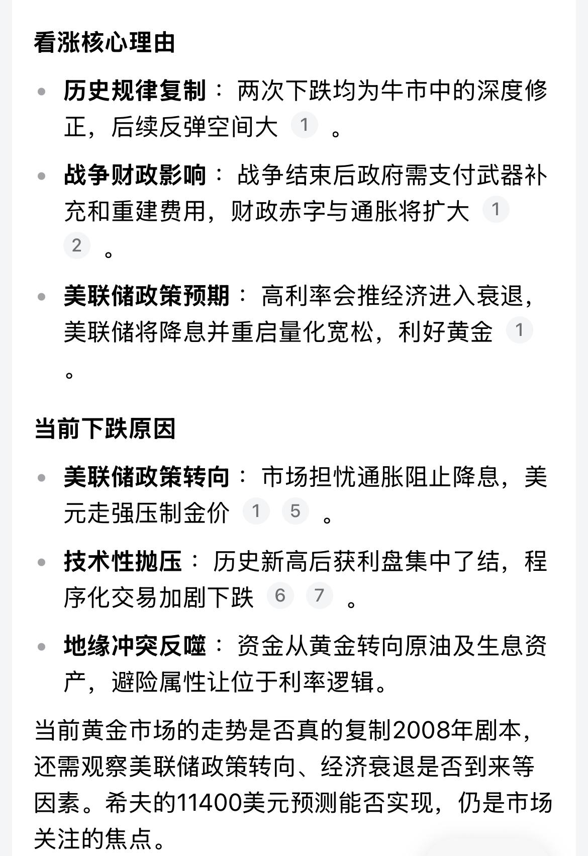 黄金价格跌2%再破4400美元关口,目前局势已经释放缓和势头,石油价格回落,而黄金则跌势不减,有些太反常规。 而国际知名专家预测称目前黄金的走势与2008年极其相似。并预测黄金价格将暴涨到11400美元/盎司。这是一次十分大胆的预测,感觉有点不可思议,但是目前全球经济积累的风险确实比2008年要高很多,关键目前还有太多的战争冲突在发生,旧的世界格局被打破新的格局未产生,搞不好就是经济危机与世界大战一并发生。 那么到时候迎来真正的黄金大牛市,牛市可是不言顶的。