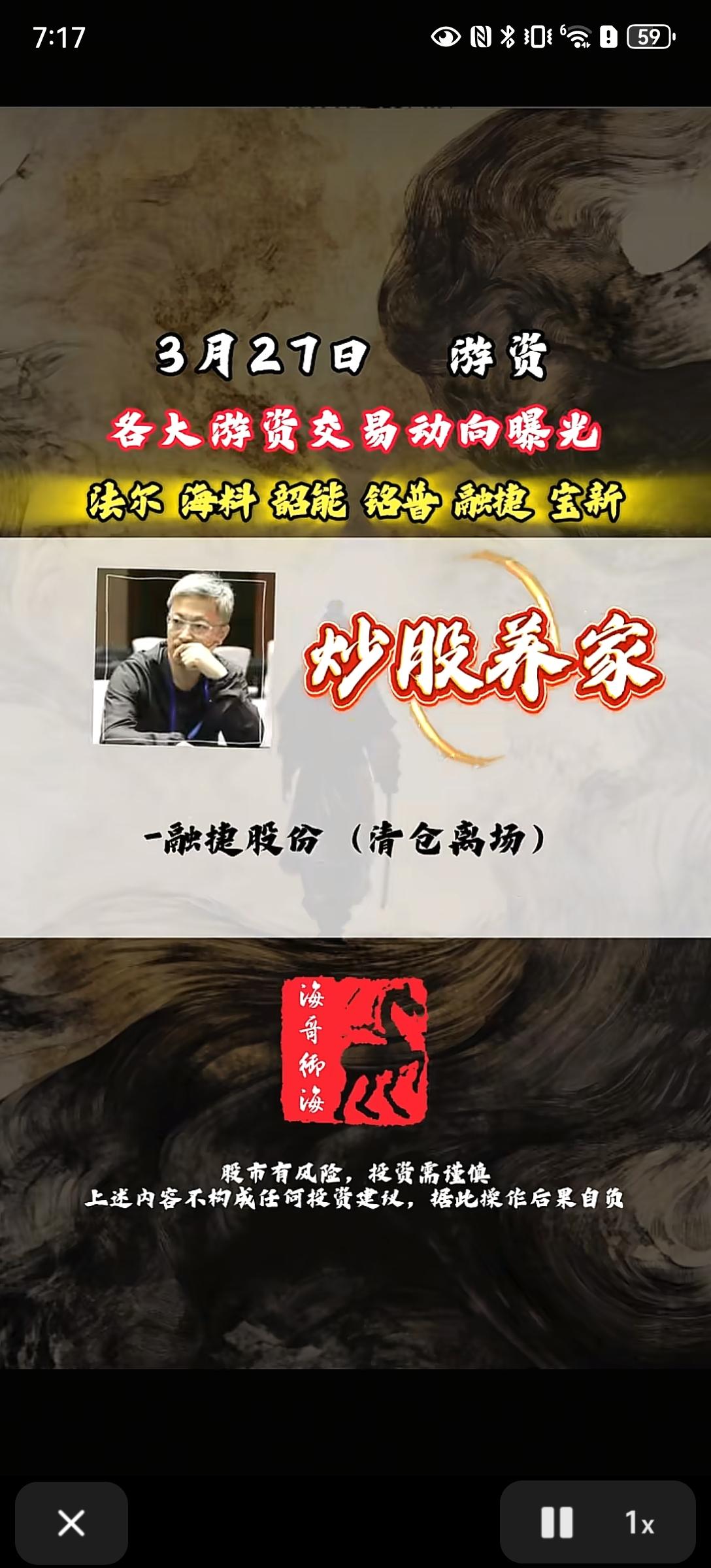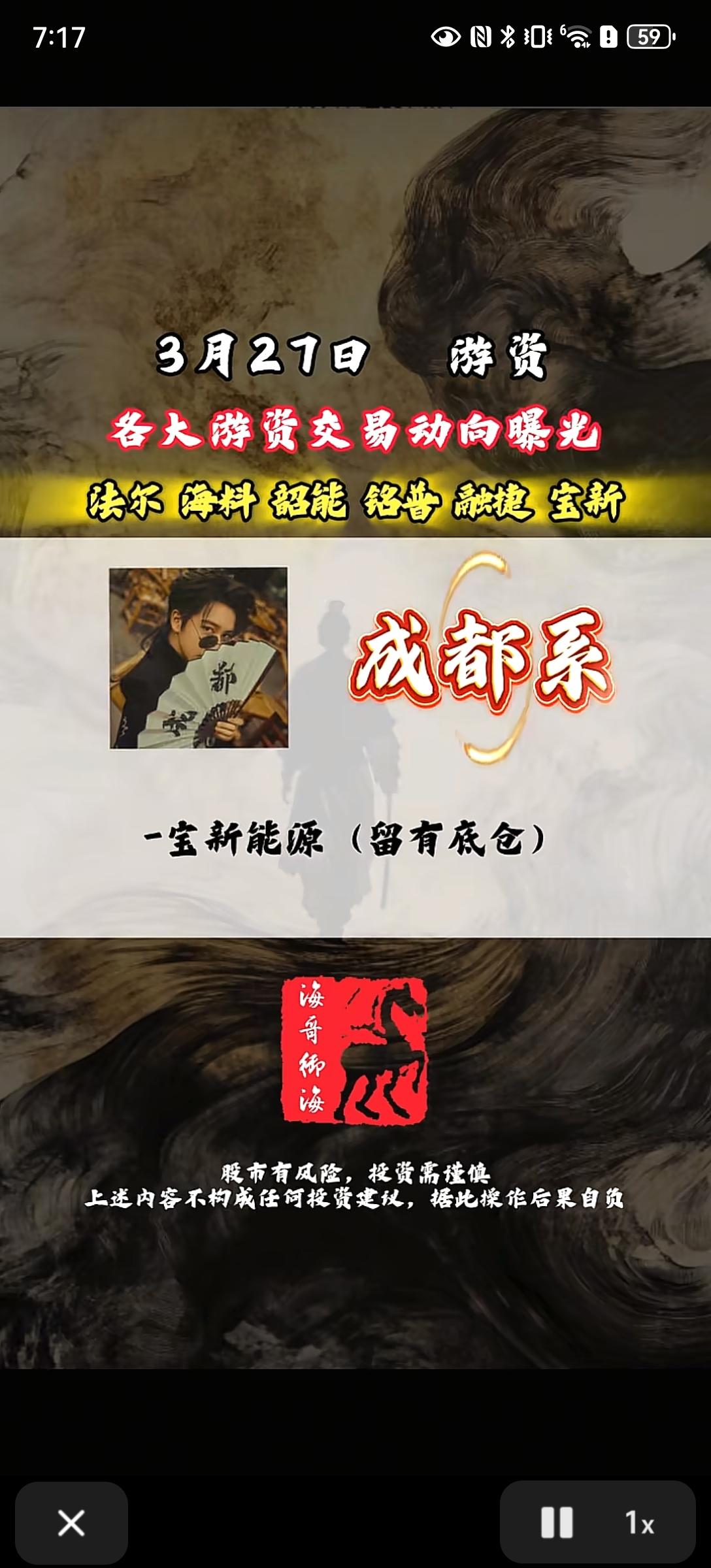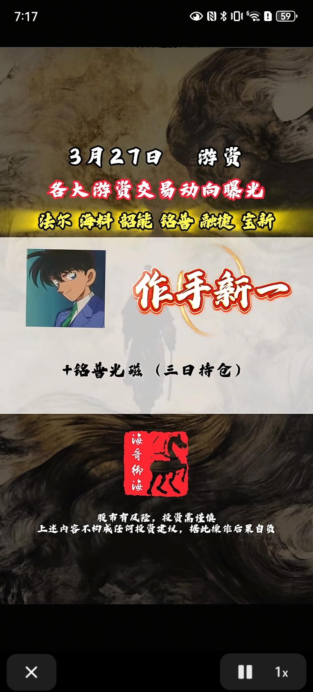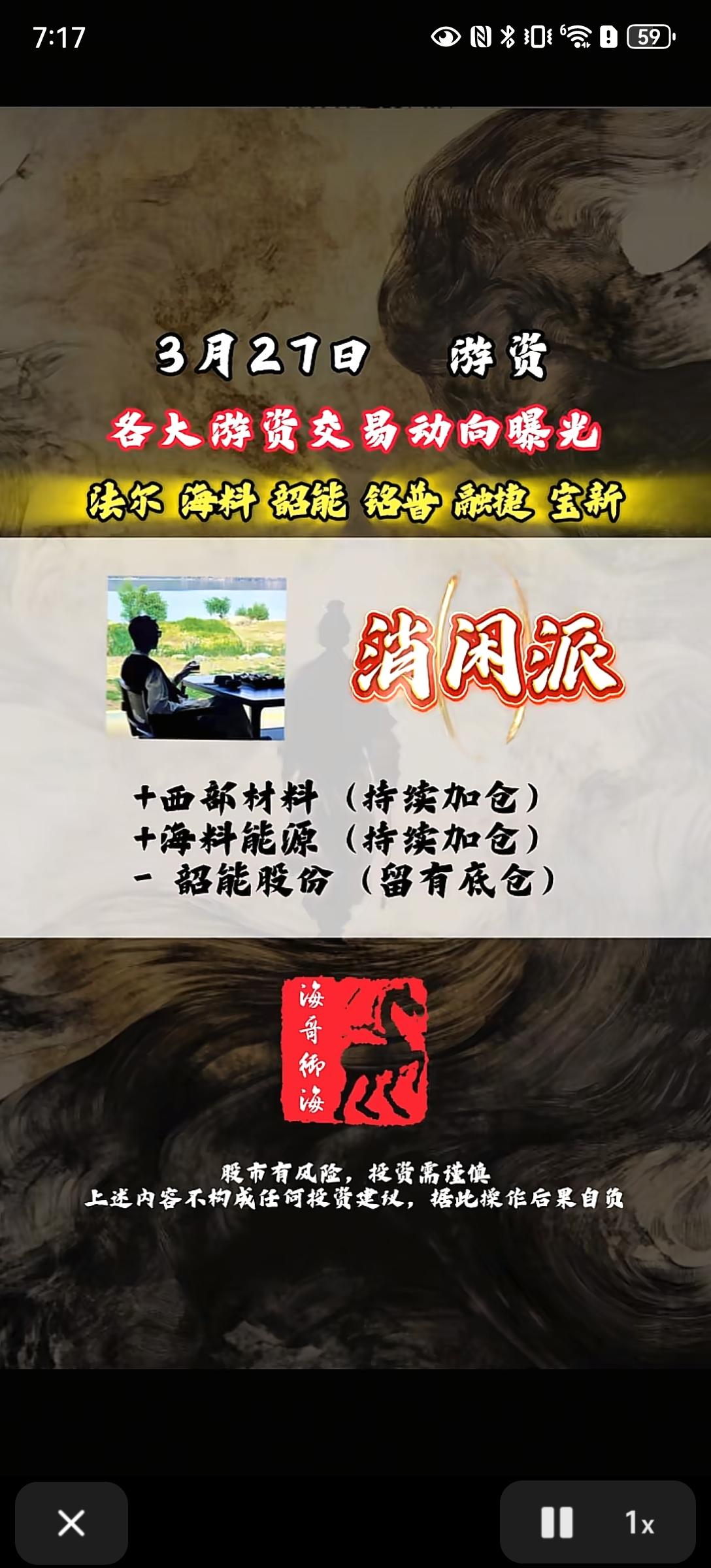 3月27日知名游资交易动向解析📊 3月27日,A股市场知名游资交易动向分化明显,呈现“加仓核心赛道、减仓高位标的”的特征,反映出资金对短期行情的谨慎判断。 加仓方向:陈小群持续加仓法尔胜,体现对该股的强势看好;消闲派同步加仓西部材料与海料能源,聚焦新材料、能源赛道,这类标的或具备题材催化与业绩预期,成为游资短期进攻主线;作手新一以三日持仓策略布局铭普光磁,偏向中期趋势博弈,显示对科技赛道的信心。 减仓与观望动作:炒股养家清仓融捷股份,成都系对宝新能源仅保留底仓,消闲派也减持韶能股份留底仓,这类操作反映出资金对高位股或逻辑弱化标的的获利了结意愿;章盟主选择“闭关修炼”,无明确交易动作,体现其对当前市场波动的观望态度,或在等待更明确的行情信号。 整体来看,游资操作呈现明显的“进攻与防御并存”格局:一方面围绕强势题材加仓布局,另一方面对风险标的快速减仓避险。投资者需注意,游资动向具有短期性与博弈性,仅可作为市场情绪参考,切勿盲目跟风操作,需结合公司基本面与行业逻辑理性决策。