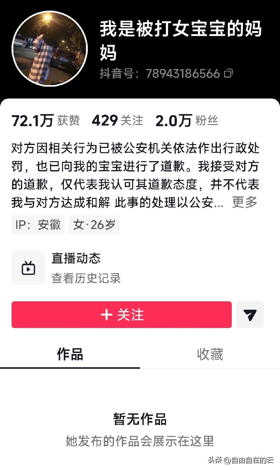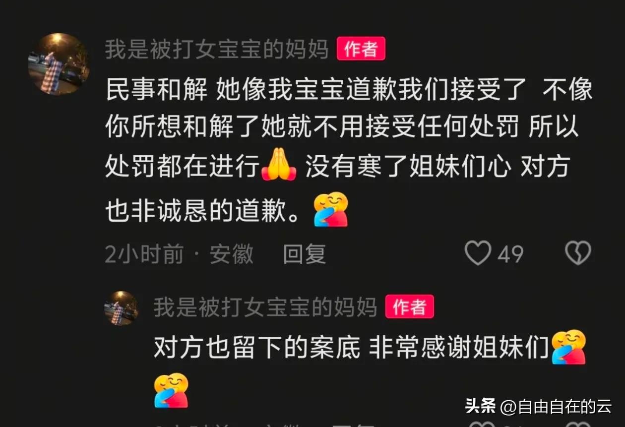 六安被打女宝宝的妈妈已经把全部视频都给删了,她在简介里说她没有与对方达成和解,只是接受了对方的道歉态度,因为对方道歉还挺诚恳的。 她说对方也被拘留了,也受到了惩罚。 可是官方通报的是他们已经和解了,后来她解释是民事和解。我觉得这个妈妈说的话我有点搞不懂,民事和解不就是对方愿意赔偿,然后你们给予谅解,她就算受到处罚,也能轻一点吗?这不就是和解吗? 为什么她一直在强调没有和解,我觉得是因为开始的时候,她一直信誓旦旦的对网友说坚决不和解,怕网友揪着这点不放吧。 其实这是你自己的事,只要你不去做网红,网友很快就会把这件事忘了的。