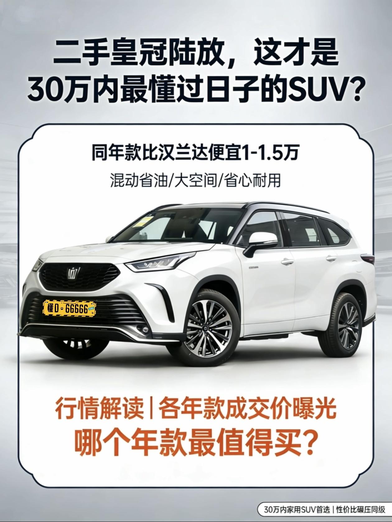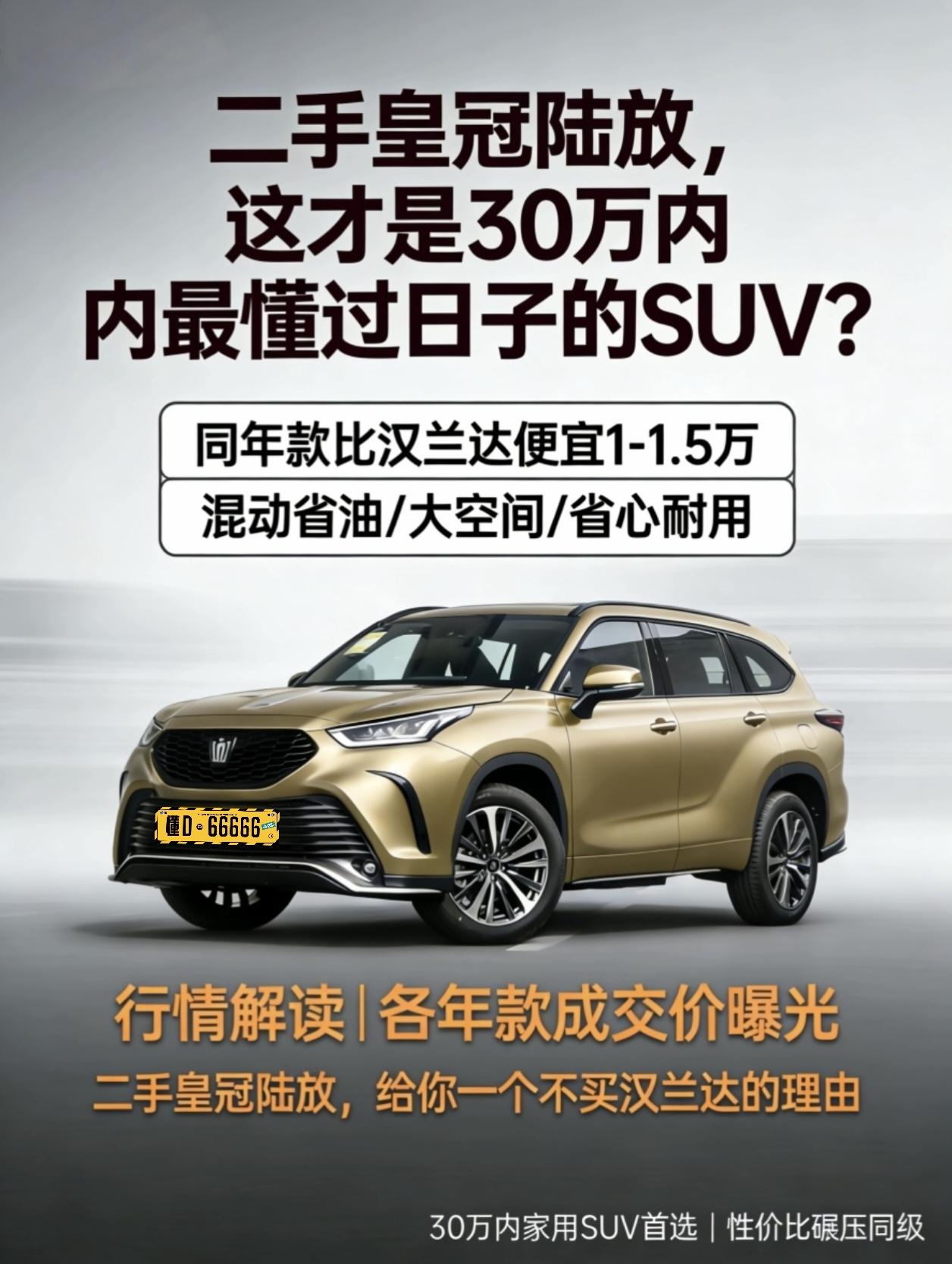 二手皇冠陆放,这才是30万内最懂“过日子”的SUV? 说到30万左右买个大空间、省心耐用的家用SUV,很多人的第一反应还是丰田汉兰达。但在2026年的今天,我想给你指条明路:去二手车市场看看皇冠陆放。 它不只是“换壳汉兰达”,更是丰田在中国市场投放的一款带有“情感溢价”的车型。最近我跑了几家二手车市场和4S店,发现了一个非常有趣的“价格倒挂”现象,这给了我们一个绝佳的“捡漏”机会。 核心原因在于新车市场的价格战传导到了二手车市场,导致二手车价格体系重构。 皇冠陆放虽然顶着“皇冠”这块金字招牌,但在二手车商眼里,它的流通性依然略逊于“汉兰达”这个硬通货。然而,随着2026款新车上市(指导价28.48万起,终端优惠后裸车甚至低至24万左右),老款二手车的价格正在经历一波“大跳水”。 这就出现了一个认知差:很多人还觉得皇冠陆放保值,或者觉得它比汉兰达贵。实际上,在二手车市场,同年份、同车况的陆放,往往比汉兰达便宜1万-1.5万元。 这就是我们的机会。 同样的第五代THS混动系统、同样的2850mm轴距,你却能以更低的价格,买到隔音更好(双层夹胶玻璃)、内饰更豪华(翻毛皮+实木)、外观更年轻(黑化套件)的“皇冠”。 现在的行情变化很快。我梳理了目前市场上主流年款的真实合理成交价区间(以2.5L混动版为例,车况精品,无重大事故): 1. 2021款(最早一批):抄底首选 核心差异: 这是初代车型,部分早期批次车机系统反应稍慢,但机械素质绝对过硬。 合理成交价:19.5万 - 21.5万元 购买建议:值得买,性价比之王。 现在新车价格下探,导致21款二手价格崩得比较厉害。如果你预算在20万出头,买这台车最划算。比同年份汉兰达便宜,而且配置通常更高(很多带四驱)。省下的钱,足够你加满好几年的92号油。 2. 2022款/2023款(中期改款):均衡之选 核心差异: 主要是解决了车机痛点,智能化配置有提升,内饰细节更精致。 合理成交价:22.0万 - 25.0万元 购买建议:按需购买,注意比价。 这个年份的车源,车况通常很新。但要注意,现在2026款新车的低配版优惠后也就24-25万左右。所以,如果二手卖家报价超过25万,直接建议他“出门左转买新车”。这个价位区间,只有当二手陆放比新车便宜3万以上时,才具备入手意义。 3. 2024款(准新车):谨慎入手 核心差异: 配置进一步下放,但核心机械结构无变化。 2026年合理成交价:26万元以上 购买建议:不推荐。 理由很简单:不划算。现在新车市场竞争激烈,2026款新车终端优惠巨大(部分地区优惠4-5万)。花26-27万买个二手的2024款,不仅没有质保优势,还得承担前任车主的用车风险,纯属“大冤种”行为。 买二手车,最怕被“面子”绑架。很多人非汉兰达不买,是觉得卖车时能多卖钱。但冷静下来算笔账: 用车体验更好: 皇冠陆放的底盘质感更紧致,隔音水平(尤其是高速风噪控制)明显优于汉兰达。对于一家老小出游来说,这份“安静”比卖车时多卖的那几千块钱更实在。 配置碾压: 同样的预算,买汉兰达可能只能买到低配“毛坯房”,但买陆放能上高配。比如360度透明底盘、HUD抬头显示、座椅通风加热,这些在陆放上普及率很高,但在汉兰达上往往是顶配才有。 油耗无差别: 都是丰田第五代智能电混双擎,WLTC综合油耗都在5.8L-6.0L/100km左右。加92号油,一箱油跑800公里,这才是“过日子”的核心。 我的最终建议 在2026年的今天,皇冠陆放不再是那个“高不可攀”的旗舰,而是一个“性价比极高”的务实之选。 如果你预算在20万左右,想找一台能开十年、省心省油、空间巨大且带有一定豪华感的SUV,2021款或2022款的皇冠陆放四驱版绝对是比汉兰达更聪明的选择。 别被“保值率”三个字吓住,你买入时便宜的那1万多块钱,才是实打实省下来的真金白银。你的下一台车,何必一定是汉兰达?【来自懂车帝车友圈】