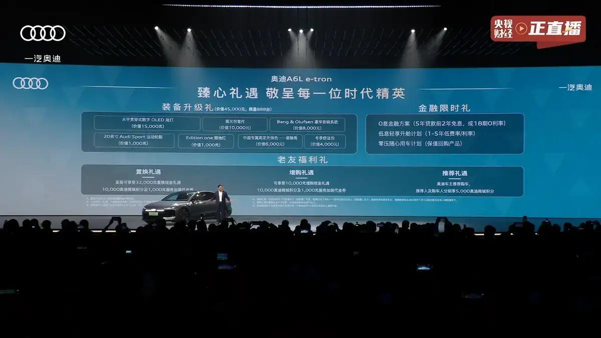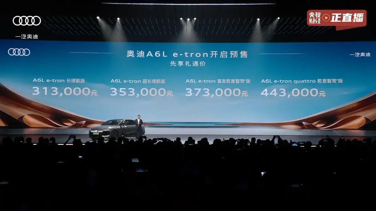 话说这一日,豪车界骤起风云,奥迪 A6L e-tron 正式开启预售,共推出四款车型,预售区间三十一万三千元至四十四万三千元。 车内空间极为宽绰舒展,气度不凡。外观延续奥迪经典大尺寸格栅气场,分体式大灯搭配激光雷达,日间行车灯更有八种样式可供切换。 尾灯采用第二代 OLED 光源,八种灯语随心变幻,遇险情可自动亮起警示标识,车标亦能夜间点亮,科技格调尽显。内饰之中三块高清大屏错落排布,尺寸分明,视觉效果颇为大气。第二代 AR-HUD 抬头显示系统,可清晰呈现导航路况等诸多信息。 全车传感器自带恒温清洁功能,城区智能驾驶可从容变道、规避突发险情,恪守限速规范,行驶安稳可靠。动力层面更是强劲非凡,单电机版本续航出众,双电机版本综合功率可达四百零五千瓦,零百加速四点五秒,迅猛如电。 整车依托高压平台打造,支持大功率快充,十分钟即可补充可观续航里程,长途出行再无续航之忧。