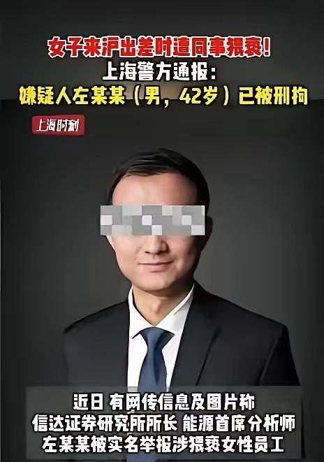 打一针就好!上海研究所所长出差猥亵女下属,职场恶行必遭严惩 上海,某研究所所长带着女下属出差时猥亵了女下属,还对女下属说:“只要打一针就好”,吓得女下属奋力反抗。 这句令人毛骨悚然的话,藏着最卑劣的恶意,看似轻描淡写的安抚,实则是掌权者对女性的公然胁迫,嚣张嘴脸暴露无遗。 涉事人是信达证券研究所所长左前明,42岁的他身为金融行业资深高管,手握管理职权,却借着出差之便,对下属伸出魔爪。 事发当晚饭局结束后,他先在车内对女下属实施猥亵,抵达酒店后又强行拖拽,甚至妄图将人拉走,行为恶劣到令人发指。 受害女下属拼尽全力挣脱反抗,多亏酒店保安及时出手阻拦,才侥幸脱离危险,随后她躲进火锅店求助,第一时间报警维权。 上海浦东警方经全面调查取证,案件事实清楚、证据确凿,左前明因涉嫌强制猥亵罪,已被依法刑事拘留,毫无狡辩余地。 信达证券第一时间发布公告,已全面暂停其所有职务,启动内部彻查程序,这位昔日行业高管,瞬间身败名裂,沦为阶下囚。 职场从来不是法外之地,更不是掌权者恃强凌弱的后花园,身居高位就肆意践踏他人尊严,终究要为自己的恶行付出惨痛代价。 现实中,太多职场女性遭遇骚扰后,因忌惮领导权势、害怕丢工作选择隐忍,反而让这类恶人愈发有恃无恐、变本加厉。 这位女下属的勇敢反抗,给所有受害女性树立了榜样,面对不法侵害,绝不妥协退让,果断报警维权才是最正确的选择。 据全国妇联相关调研数据显示,超七成职场女性曾遭遇不同形式的职场骚扰,而敢于公开维权的比例不足12%,沉默只会纵容罪恶。 权力从来不是作恶的保护伞,高学历、高职位更不等于好品行,德不配位者,即便站得再高,也终将被法律制裁、被道德唾弃。 企业选拔管理者,绝不能只重业务能力,必须严把品德考核关,建立健全职场反骚扰机制,切实守护每一位员工的人身安全与尊严。 我国刑法对强制猥亵、侮辱罪有明确量刑规定,此类恶行一旦定罪,不仅要面临牢狱之灾,更会留下终身案底,彻底毁掉人生。 这起事件给所有职场人敲响警钟,面对职场霸凌与不法侵害,别怕发声,唯有勇敢反抗,才能让恶人无处遁形,守住自身底线。 各位读者你们怎么看?上海猥亵事件 猥亵要判刑 上海猥亵男 女员工遭性骚扰