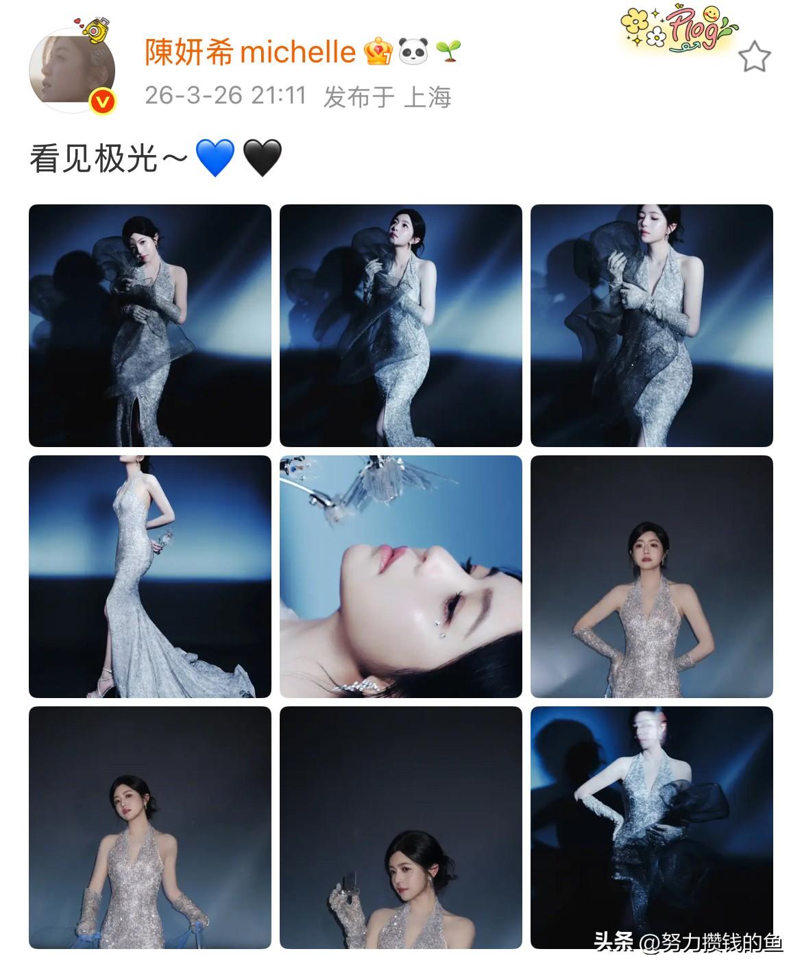 陈妍希,太漂亮啦 3月26日,陈妍希在社交平台分享了一组照片,让人看到后,不得不感叹:真是太漂亮啦 照片中,陈妍希一袭挂脖修身长裙,裙子闪闪的,显得整个人在发光,完美的展现了她的魅力; 陈妍希说:看见极光~ 网友们看到后,纷纷留言: 姐姐今天超级美,不用去挪威了,我的极光在这 蝴蝶飞进了极光🦋 家姐就这样美翻全世界