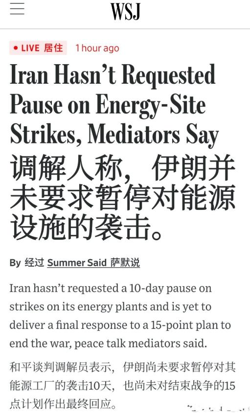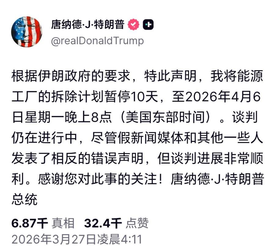 中国有句民间俗话:公说公有理,婆说婆有理。这句话来形容现在的美伊正合适,当地时间3月26日特朗普谈伊朗,称应伊朗政府请求,我将把能源设施的摧毁行动推迟10天,延至2026年4月6日(星期一)东部时间晚8点。 然而WSJ消息称:伊朗并未要求暂停对能源设施的袭击。 双方各执一词,到底谁说得是真话? [呲牙]评一下这个消息:特朗普的发文与伊朗的回应自相矛盾,抛开别的不说,非常佩服美总统的口才,可以面对媒体一本正经的说谎,不管说得是真是假,为的就是让对手分不清真实消息。 站在特朗普这一方来说,放出的消息都是应对策略,毕竟打仗不是嘴上说说而已,需要动用不少资源,还牵动着多方利益,况且国内反战的越来越多,老百姓希望和平,稳定物价。