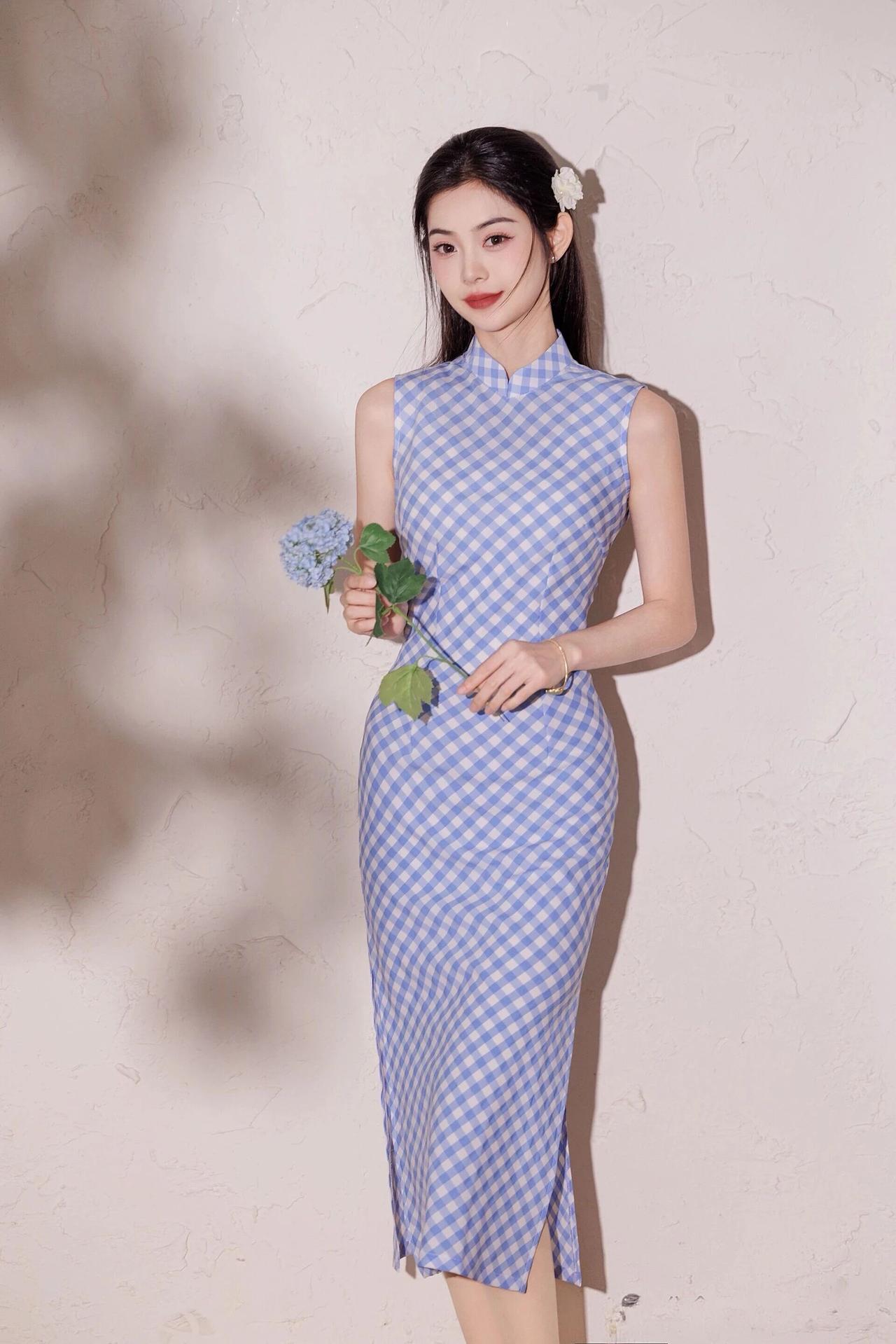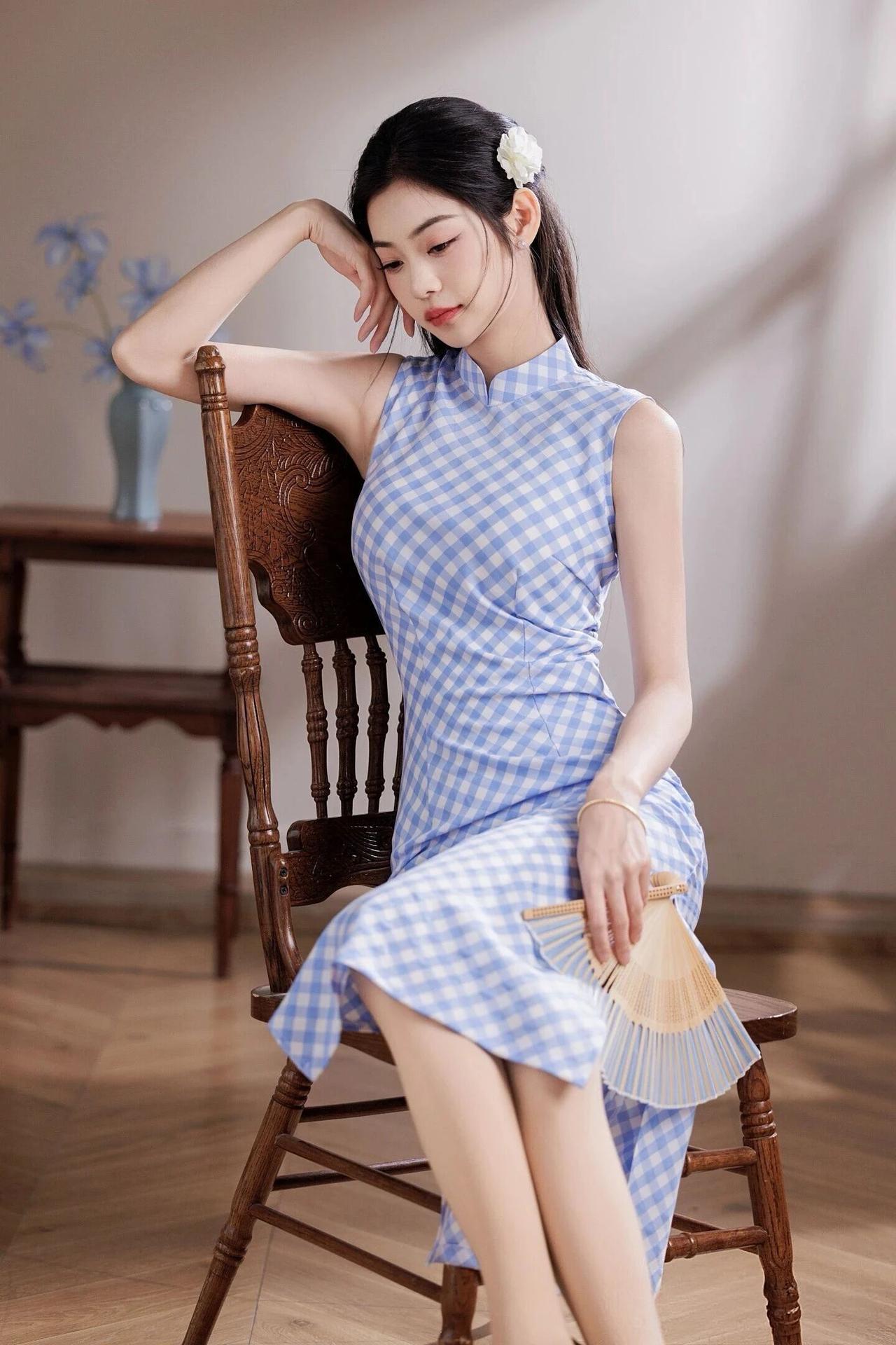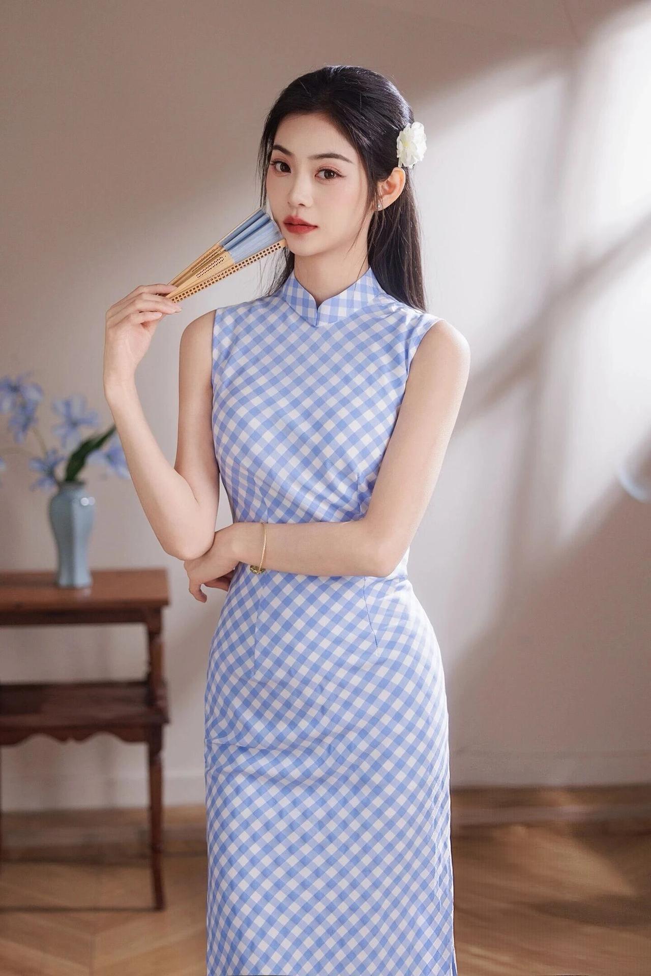 她乌黑长发束起,鬓边别一朵白色小花,温婉又灵动。旗袍采用经典的蓝白格纹面料,清新雅致,高领无袖设计勾勒出优美的肩颈线条,修身版型尽显曼妙身姿,开衩裙摆更添几分灵动。 手持折扇、轻握蓝花,或静立、或倚坐,姿态优雅。暖调光影洒落,衬得肌肤白皙,眉眼清澈,红唇点缀更显明艳。整体造型简约而不失精致,既有东方女性的温婉端庄,又带着少女的清新甜美,宛如春日里的一抹清风,温柔又治愈。