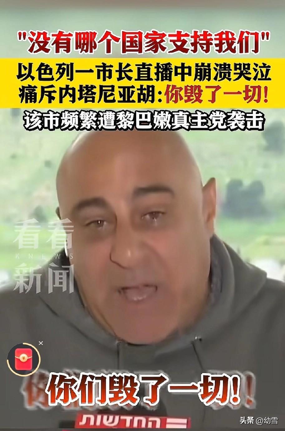 前线市长一声哭, 撕碎以色列最后遮羞布! 清醒者自白:我们在自食恶果。 “没有哪个国家支持我们,你毁了一切!”以色列北部边境城镇马尔加利奥特市长埃菲·达姆蒂(Efi Dhamti)在电视直播中情绪彻底崩溃,掩面痛哭怒斥内塔尼亚胡政府。 作为直面黎巴嫩真主党火箭弹袭击的一线官员,他控诉中央政府既无法提供有效防御,又让以色列陷入了空前的国际孤立。 这座仅有约3000人口的小镇,如今已沦为“半废弃战场”。 自本月初真主党加强攻势以来,当地设施损毁严重,居民被迫长期躲在防空洞中,大量民众逃离家园。 市长绝望地表示,他们被世界抛弃了,只剩下警报声和废墟相伴。 这段视频之所以震撼,是因为它撕开了强硬政策的遮羞布。 当一位身处战火中的市长哭诉“没有国家支持”时,这不仅是军事上的挫败,更是外交和道义的破产。 正如网友所言:知道自己国家的恶行,不反抗,子孙后代将永远活在仇恨的循环里。 为了下一代,停止侵略,守住本分,才是唯一的出路。 图片来源于视频截图,若侵权告知必删