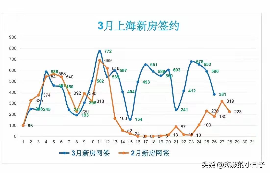 继续稳!“大阳春”! 3月26日周四,上海的楼市成交数据!二手房达到945套,没问题,继续保持900套以上的水平。 第二,新房的成交有点下滑,新房当日只有381套,明显低于日均新房销售量447套。 当然,还是那句话,一天两天的成交,说明不了全局的走势。 目前还是判断3月份大阳春!二手房3万套的目标不变。 很多人说,三月份本来就是旺季,有要小孩读书的,抓紧落户才来得及今年的9月。 其实,有一定的客户群体,但是今年的二手房数据已经明显高于去年三月。 所以,我才说,不是小阳春,今年是大阳春,流量的大阳春!