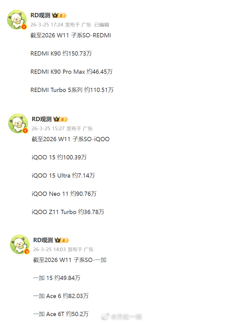 这是REDMI、iQOO、一加去年年底到现在新机的销量