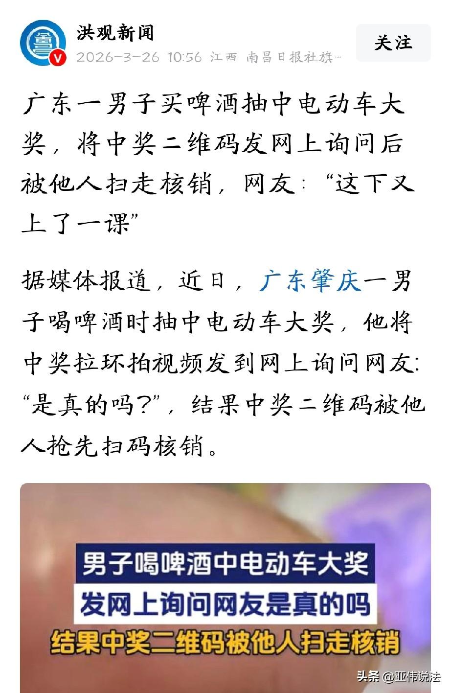 乐极生悲!广东肇庆,男子买啤酒,意外中了一辆电动车,他又惊又喜,又怀疑是厂家搞虚假宣传,就将中奖二维码拍成视频发到网上,想找网友确认一下。万万没想到,等他满心欢喜去兑奖时,却发现,二维码被人抢先一步核销了,男子瞬间蒙圈。网友调侃∶被人上了一课,心疼哥们三秒钟! 男子平时最大的爱好就是喝点小酒,家里的啤酒从来没断过,每次都是一箱一箱往回搬。 可最近,他却因为这酒,经历了一场“过山车”式的心情起伏,那乐极生悲的滋味,让他悔得肠子都青了。 这天,他像往常一样,从箱里掏出一罐啤酒,“啪”地拉开拉环。 刚要往嘴里送,眼睛突然被拉环上的字晃了一下,竟然印着“电动车壹台”的中奖信息。 他瞬间愣在原地,接着又惊又喜,活了这么大,还是头一回中这么大的奖,激动得手都有点发抖。 可兴奋劲儿一过,他心里又犯起了嘀咕,这不会是假的吧?现在商家的套路这么多,别是我喝晕了看错了? 越想越不确定,他干脆拿起手机,把中奖拉环拍了个清清楚楚的视频,发到网上询问网友∶各位老铁,你们看看,我这中了个电动车大奖,是真的吗? 他满以为能得到大家的祝福和确认,可万万没想到,就是这一拍,把到手的大奖给拍没了。 原来,男子发的视频里,中奖二维码拍得明明白白,有网友看到后,悄悄扫了码,抢先一步把大奖核销了。 等男子反应过来,兴冲冲地去兑奖时,却被商家告知奖已经被领走了。 男子瞬间如遭雷击,从云端一下子掉进了谷底。他怎么也想不通,自己一时大意,却给别人做了嫁衣? 对此,网友们也炸开了锅。有网友替他着急,系统里肯定能查到是谁核销的,赶紧报警,说不定还能找回来。 也有人哭笑不得地调侃,这下可真是上了生动一课,乐极生悲啊!以后可得低调点。 这下好了,第二波视频的素材有了,发到网上说大奖被谁领了,这流量绝对比第一个还高! 男子看着网友们的评论,心里五味杂陈。本来是喝小酒喝出来的天大喜事,结果却闹得这么糟。 这件事说到底,就是个“信息泄露”的极致缩影,你以为发个视频是分享喜悦,但在有心人眼里,那就是一份自助兑奖指南。 心疼男子三秒钟,但不得不说,这大概是今年最“提神醒脑”的一次中奖体验了。 他虽然损失了一辆电动车,但他给全网贡献了一个很有意义的教训∶碰到中奖这种天上掉馅饼的好事,千万别太着急晒,一定要低调,小心煮熟的鸭子飞了。 《民法典》第九百八十五条规定:得利人没有法律根据取得不当利益的,受损失的人可以请求得利人返还取得的利益。 抢先扫码核销的网友,在无任何合法依据的前提下,通过使用男子公开的中奖二维码,获取本应归属于男子的电动车奖品,直接造成男子中奖权益落空,符合不当得利的构成要件。 即便男子因疏忽将二维码公之于众,仅属于自身过失,并非对扫码者的授权或赠与,男子有权要求对方返还奖品或赔偿等值财产损失。 男子可先联系品牌方与兑奖平台,调取核销记录锁定扫码者信息,固定视频发布、二维码被抢先核销的证据。 若对方拒不返还,可向法院提起民事诉讼主张返还不当利益。
