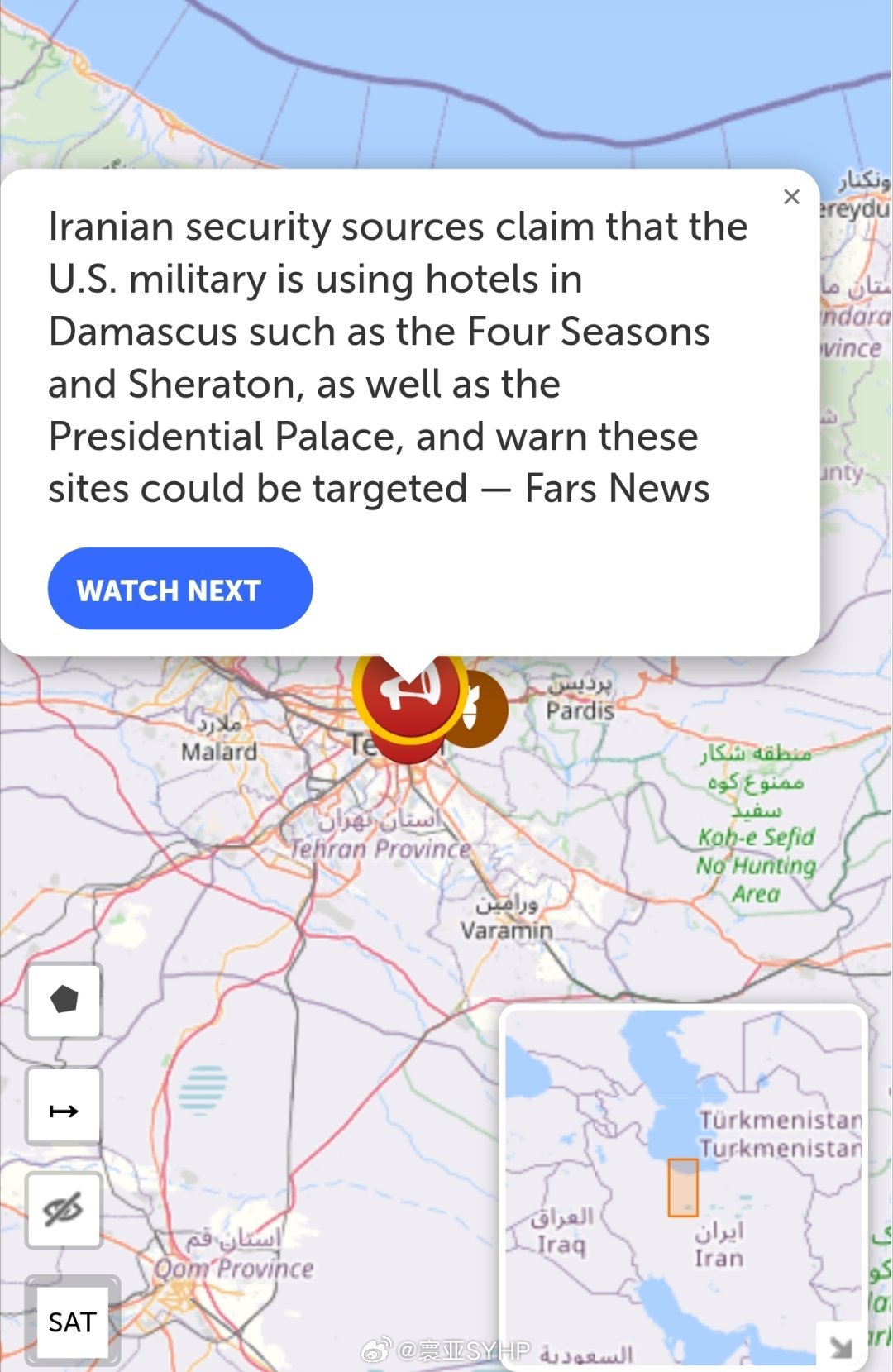 伊朗拟将叙利亚列入打击目标法尔斯通讯社:伊朗安全部门消息人士称,美军正在利用叙利亚大马士革的四季酒店、喜来登酒店以及总统府等场所,并警告称这些地点可能成为袭击目标。