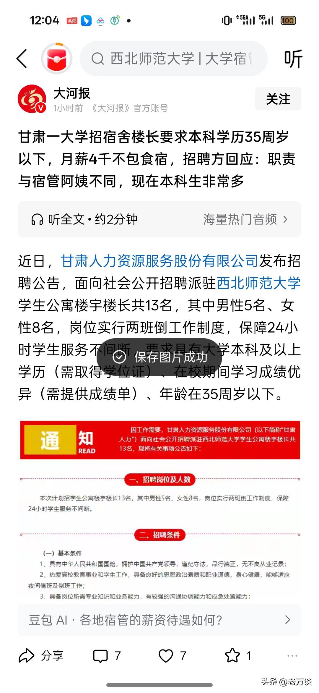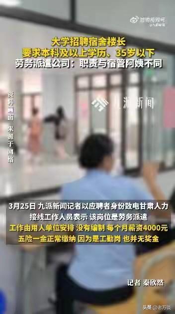 西北师范大学招聘学生宿舍宿舍长要求本科以上学历,35 岁以下,由于是工勤岗位,而且没有奖金,工资为四千元。招聘单位给出的解释,现在的本科生非常多,所以这个要求不算过分。现在大学生真的很多吗?大学生真的这么不值钱吗?更过分的是,宿舍楼长而且还要求 35 岁以下,那 35 岁以上的失业人员去哪里呢?求职市场已经没有了 35 岁以上中年人的岗位了。但是 35 岁离死亡还早得很,但是却又找不到工作。即使他们手脚齐全,而且干活积极上进,但是就是没有用人单位愿意招收他们。这份招聘真的很扎眼,应聘者必须系本科以上学历,35 岁以下,宿舍楼长!