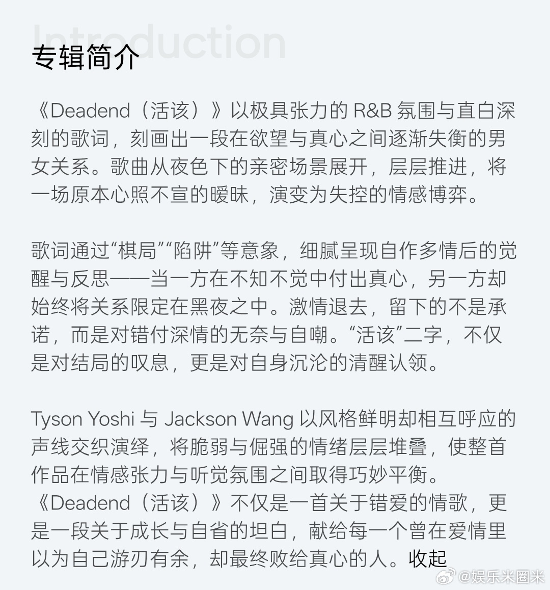 王嘉尔久违的中文歌 《Deadend(活该)》太好哭!王嘉尔唱中文情歌的杀伤力裹着R&B节奏,与Tyson合唱,句句戳心🥺