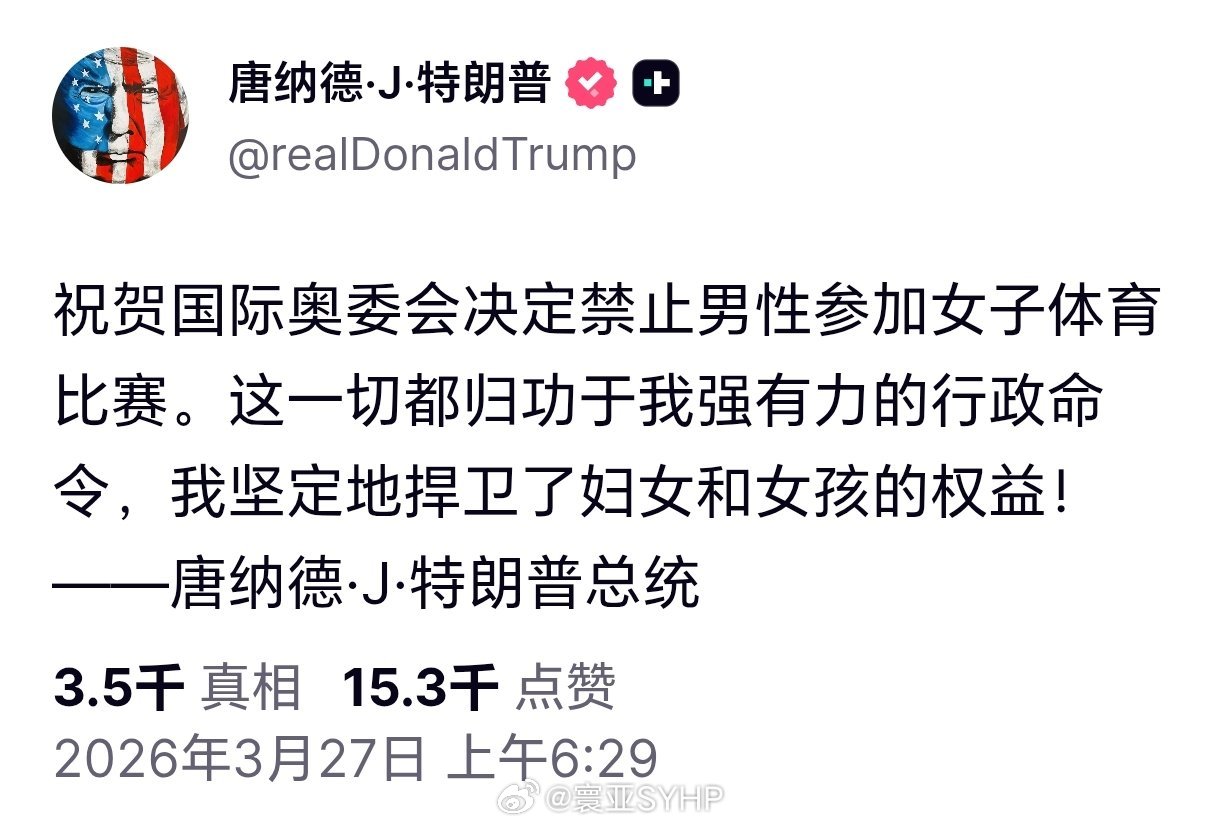 特朗普:祝贺国际奥委会决定禁止男性参加女子体育比赛。这一切都归功于我强有力的行政命令,我坚定地捍卫了妇女和女孩的权益!
