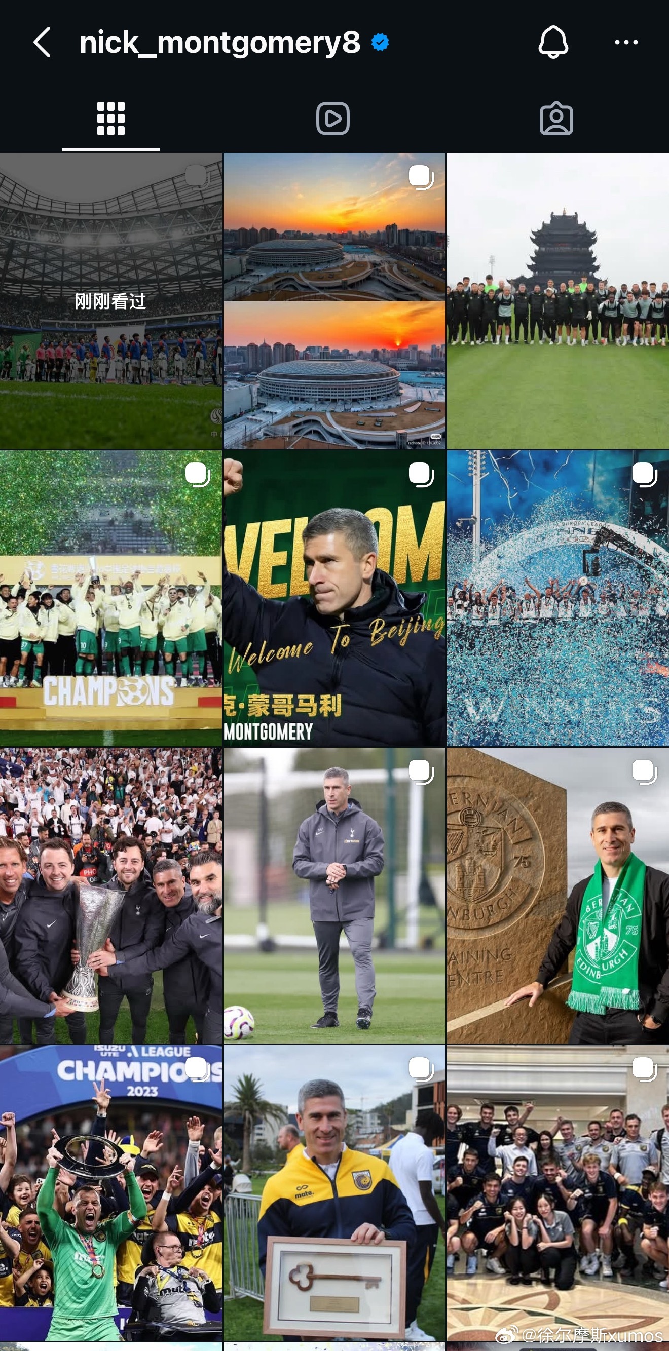 翻了翻主教练的社媒,发现蒙哥马利作为北京国安主帅发布的内容数量已经超过了他在热刺、希伯尼安时的内容数量。当然,主教练发过最多的,还得是中央海岸水手的。北京国安