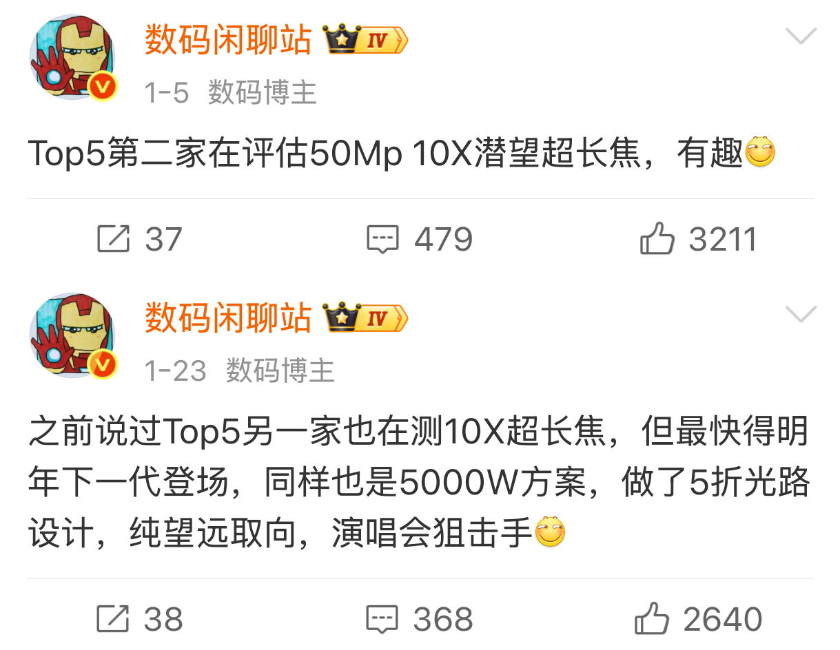 加料,最近TOP5第三家也在观望10X方案,超长焦望远或许也要成为一个 Ultra 影像新趋势。