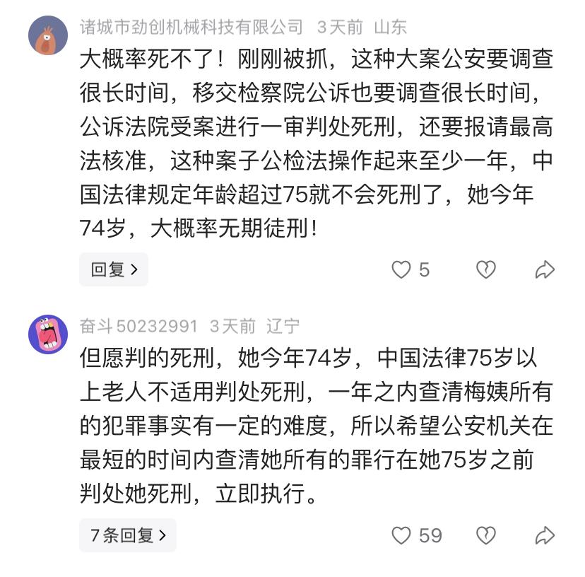 74岁的梅姨干了一辈子的坏事,经过各方努力终于把她揪出来了,她以红娘的身份做遮掩拐卖儿童,已经被查实有九名儿童被她拐卖,肯定还有更多。 梅姨今年已经74岁了,按照法律规定超过75岁已经不适合吃花生米了,还有几个月的时间案件调查清楚并审判肯定不可能了,很多人担心她不能伏法。 李大律师说梅姨罪孽深重且影响比较大,他的同案犯已经吃了花生米,梅姨不出意外会吃花生米且立即执行。 很多人都希望这个巫婆早点伏法,弥补被害家庭的创伤。