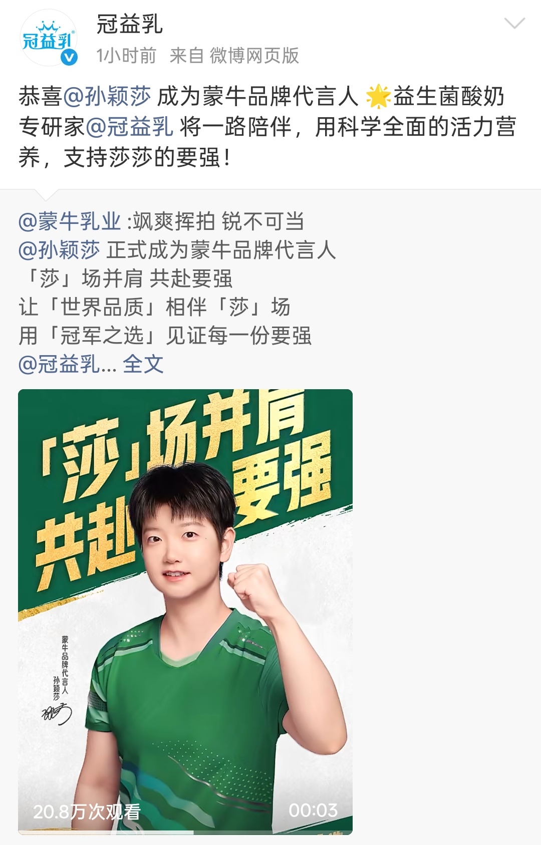 📢温馨提醒大家:本次官宣孙颖莎是蒙牛集团品牌代言人,是含金量极高的集团级大title,身份重磅、排面拉满🐮在蒙牛官方尚未正式发布莎莎其他主推系列产品之前,我们现阶段统一集中支持冠益乳即可,后续请耐心等待品牌官宣,等官方明确莎莎对应的其他蒙牛主推产品后,我们再跟着官方节奏集中购买支持。❤️