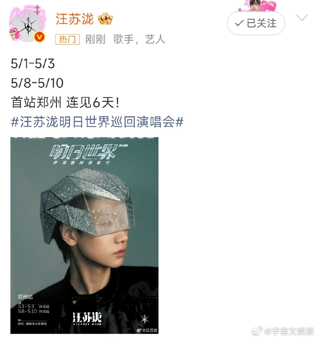 汪苏泷首站郑州汪苏泷首站郑州连见6天 汪苏泷明日世界巡回演唱会首站官宣郑州,而且