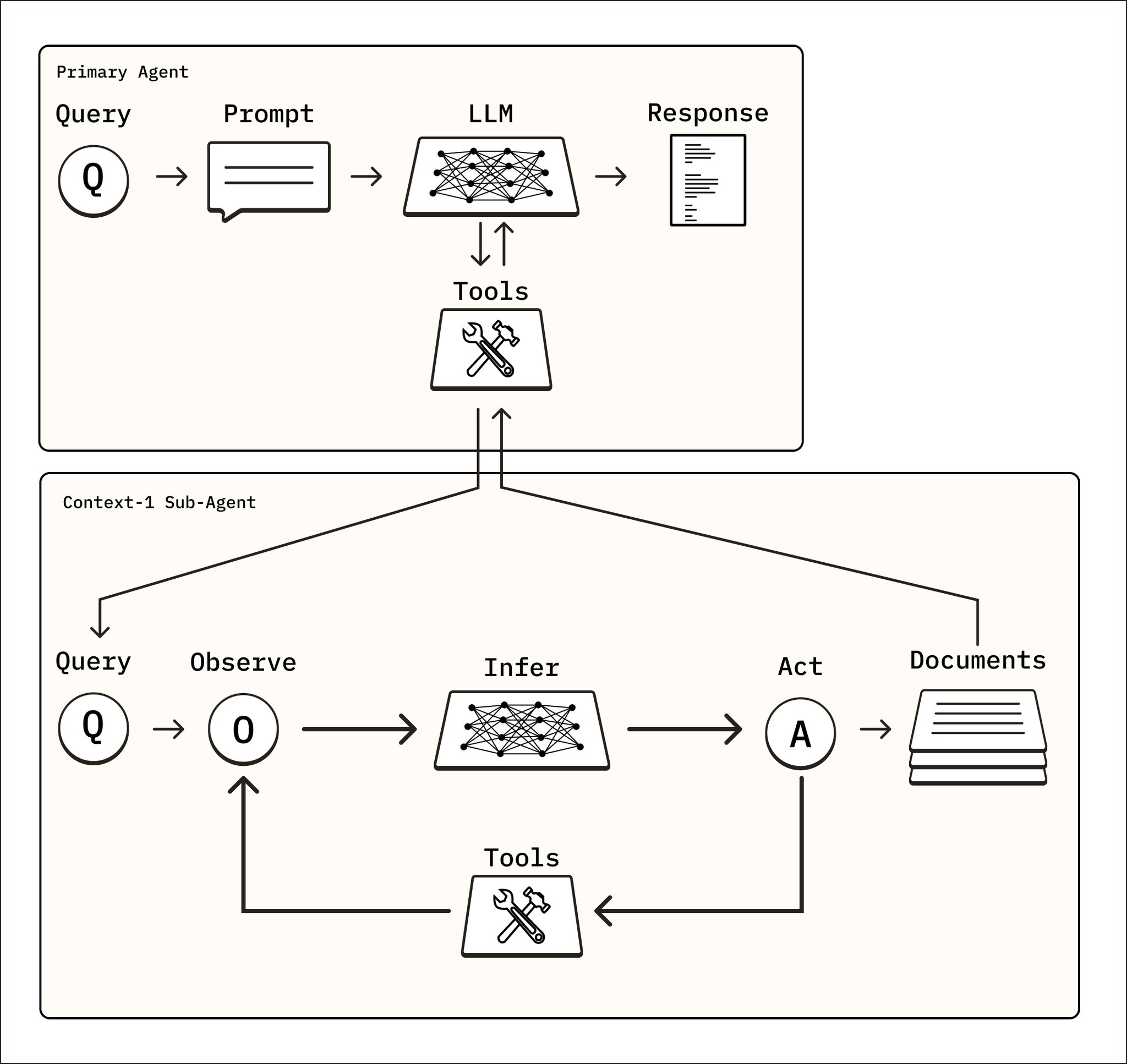 - 多跳检索(Multi-hop)——将复杂问题分解为子查询,逐步搜索- 自编辑上下文——主动丢弃无关文档,释放上下文窗口空间,避免"上下文腐烂"- 并行工具调用——每轮平均 2.56 次工具调用,比基座模型更高效