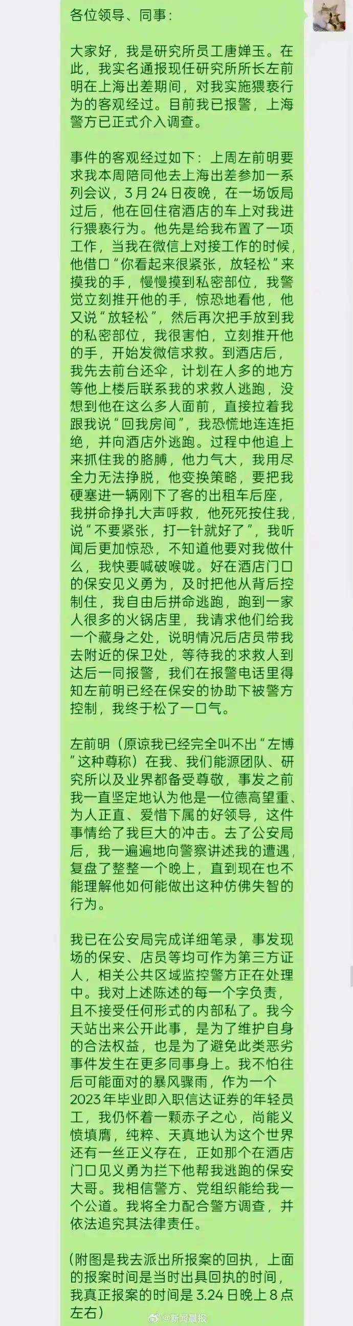 人不可貌相!左前明所长1984年出生,42岁,他看起来斯斯文文,眼睛很灵动,感觉左所长跟《狂飙》里面高启强的弟弟高启盛长得差不多。 他是学霸型精英,中国矿业大学(北京)博士;山东科技大学本硕。能源行业首席分析师,2025年7月升任所长 。 下属唐婵玉一直坚定地认为他是一位德高望重、为人正直、爱惜下属的好领导。没想到他领唐女士出差时饭后返回酒店时却对唐女士动手动脚,遭到唐女士反对后,他居然要把她硬塞进一辆刚下了客的出租车后座,还说“不要紧张,打一针就好了〞,幸好在酒店门口的保安见义勇为制止他。为自尊自爱的唐女士点赞,更为那个酒店门口勇敢的保安点赞! 3月25日晚间,官方通报正式发布:左前明因涉嫌违法,已被上海浦东警方依法刑事拘留。 大庭广众之下这么有恃无恐?他是对自己有多自信,这样好了,碰到硬茬了 网友:估计是吃惯的嘴,跑惯的腿;但常在河边跑,哪能不湿鞋!栽跟头是迟早的事。这次偷鸡不成蚀把米[大笑] 管不住下半身,下半生也毁了!本来年轻有为前程似锦,如今恐怕肠子都悔青了左前明