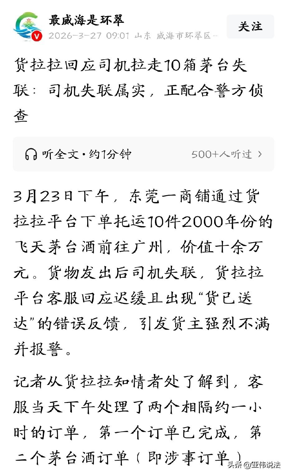 太不值当了!广东东莞,老板通过货拉拉平台下单,将10件2000年的飞天茅台酒送往广州,谁知司机接单半个多小时后,竟然连人带货消失了。这些酒价值十来万,老板急了,赶紧联系平台客服,谁知,客服竟一口咬定∶货已送达。客户连司机的面都没见,怎么可能送到,老板立刻报警。后来,平台的解释让他无语。 李老板最近急得满嘴起泡,他通过货拉拉托运的10箱茅台,没想到,司机带货竟然一起“消失”了。 3月23日下午,李老板要把10件2000年份的飞天茅台酒运到广州,这批酒价值十几万,所以他在选择运输平台时非常谨慎。 挑来选去,他特意找了货拉拉,想着大平台有保障,流程规范,总不会出岔子。 可万万没想到,货刚被司机拉走半小时,他再联系司机确认路线时,电话就打不通了。 一种不祥的预感涌上心头,他赶紧点开APP查看订单状态,上面显示“运输中”,可就是联系不上司机。 他不敢耽搁,立刻拨通了货拉拉的客服电话,听完他的描述,客服过了很久,这才慢悠悠的回复说“货已送达”。 老板当时就炸了,从东莞到广州,半个小时怎么可能到,客户连司机的影子都没见着,分明就是糊弄人。 他越想越慌,立马报了警。 货物明明没有送达,客服为什么一口咬定货已送到呢? 对此,平台解释,当天下午客服处理了两个相隔一小时的订单,第一个是同城的小件快运,确实已经完成配送。 可因为用户投诉关联出错,客服把两个订单的信息弄混了,才误把第一个订单的“已送达”状态当成了茅台酒订单的情况反馈给了货主。 目前,10箱茅台酒确实还没找到,我们也联系不上涉事司机,他的手机一直关机,定位也查不到。 平台的回复,让李先生的心悬得更高了。 他又赶紧追问平台要司机的姓名、住址、身份证号这些私人信息,想自己找人打听。 可平台一口拒绝,说要遵循司机隐私保护原则,不能随意透露。 李老板急得团团转,托了好几个行业内的朋友打听,这才知道,这个订单是货拉拉和“小拉出行”合作的,订单放进共享订单池后,由货拉拉系统里注册的司机抢单接的。 涉事司机之前没犯过类似的事,平台的信用记录里全是好评。 平台虽然一个劲表示,会全力配合警方侦查,可直到现在,李老板也没接到过警方或平台的进展通知。 十几万的货不见踪影,毫无头绪,李老板只能干着急。 那10箱茅台不仅是钱,更是他攒了好几年的信誉,客户那边天天催着要货,他只能赔着笑脸说再等等。 回过头想想,货主李老板心也是真大,这种值钱又好出手的东西,应该找固定信任的老司机运,贵点也踏实,图便宜很容易出事。 这个司机的做法也真是让人想不通,现在天眼、大数据这么严,路上到处是监控,车牌驾照都是实名,他能跑哪儿去?早晚得被抓住! 为了十来万,把自己的后半辈子搭进去,真的太傻了,这可是盗窃重罪。 《刑法》第二百七十条规定:将代为保管的他人财物非法占为己有,数额较大,拒不退还的,处二年以下有期徒刑、拘役或者罚金;数额巨大或者有其他严重情节的,处二年以上五年以下有期徒刑,并处罚金 。 司机帮货主运酒,相当于暂时替货主保管这批价值十几万的茅台,他拉着货直接失联、关机跑路,就是摆明了想把这批酒占为己有,完全符合这条法律规定的情形。 这批茅台价值十几万,已经达到法律上“数额巨大”的标准。 司机一旦被抓到,肯定要承担刑事责任,不光要把酒还回去,还会被判有期徒刑、交罚金,彻底毁了自己的人生。 另外,货拉拉平台也脱不了干系,平台作为承运方,有责任保证货物安全,客服搞错订单、不配合提供司机信息的做法不合理,货主可以找平台追责。 平台需先向货主承担赔付义务,再向实际司机追偿。 货主可通过警方调取、民事诉讼申请法院调查等途径获取关键信息,平台应全力配合警方,尽快帮货主追回损失 。