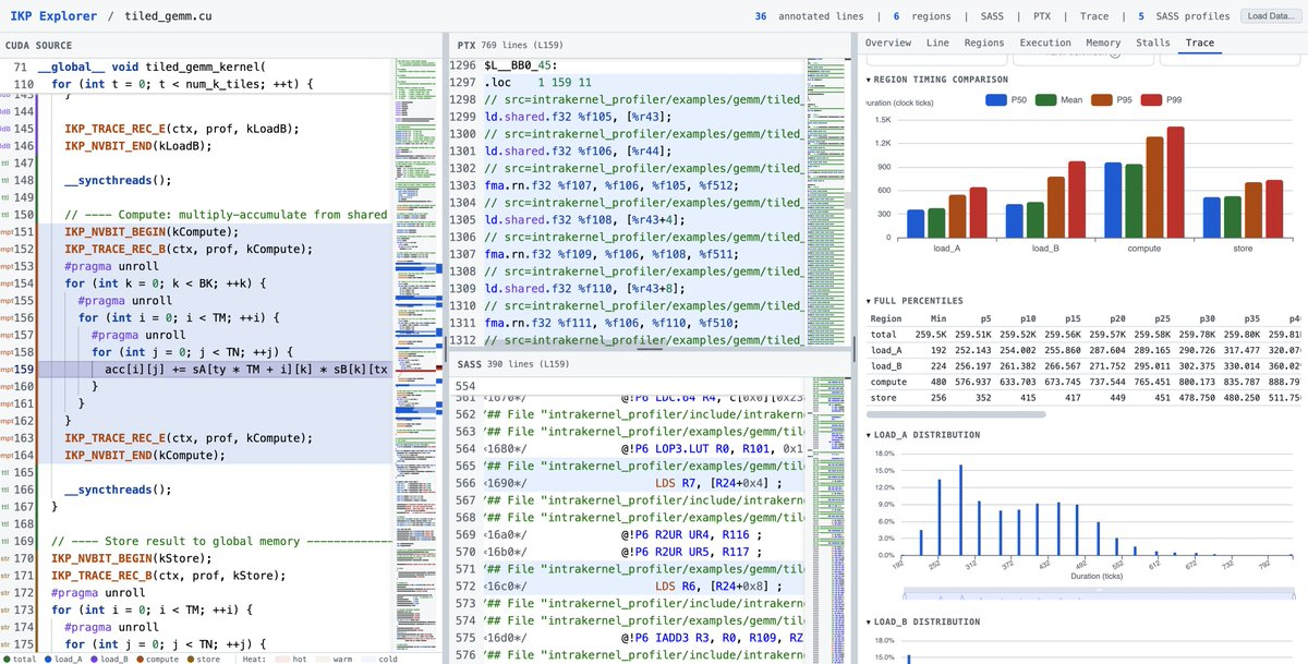 大多数 GPU 分析器(如 Nsight、NV Perf SDK)只会给出每次内核启动的单一数值:例如该内核执行了 1.2 万亿条指令,达到了 85% 的占用率。IKP 更深入。你可以在内核中用命名区域(如 load_A、compute、store)进行标记,每个指标——指令计数、内存流量、硬件计数器、停顿原因、时间——都会独立归属到每个区域。你可以看到内核的哪个阶段存在瓶颈,而不仅仅是内核整体运行缓慢。