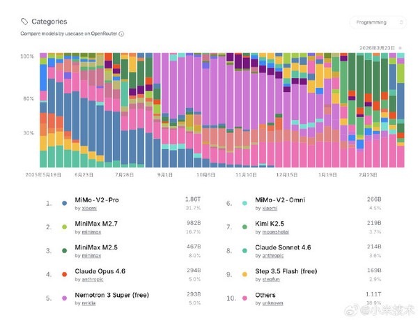 全球AI格局生变!小米MiMo-V2-Pro周Token消耗破3万亿,市占率超30%拿下OpenRouter第一。作为小米旗舰基座模型,性价比与性能双优,彻底改写海外API市场由欧美模型垄断的局面。小米小米MiMo成首个周token消耗超3万亿模型小米MiMo模型使用市占率超30%